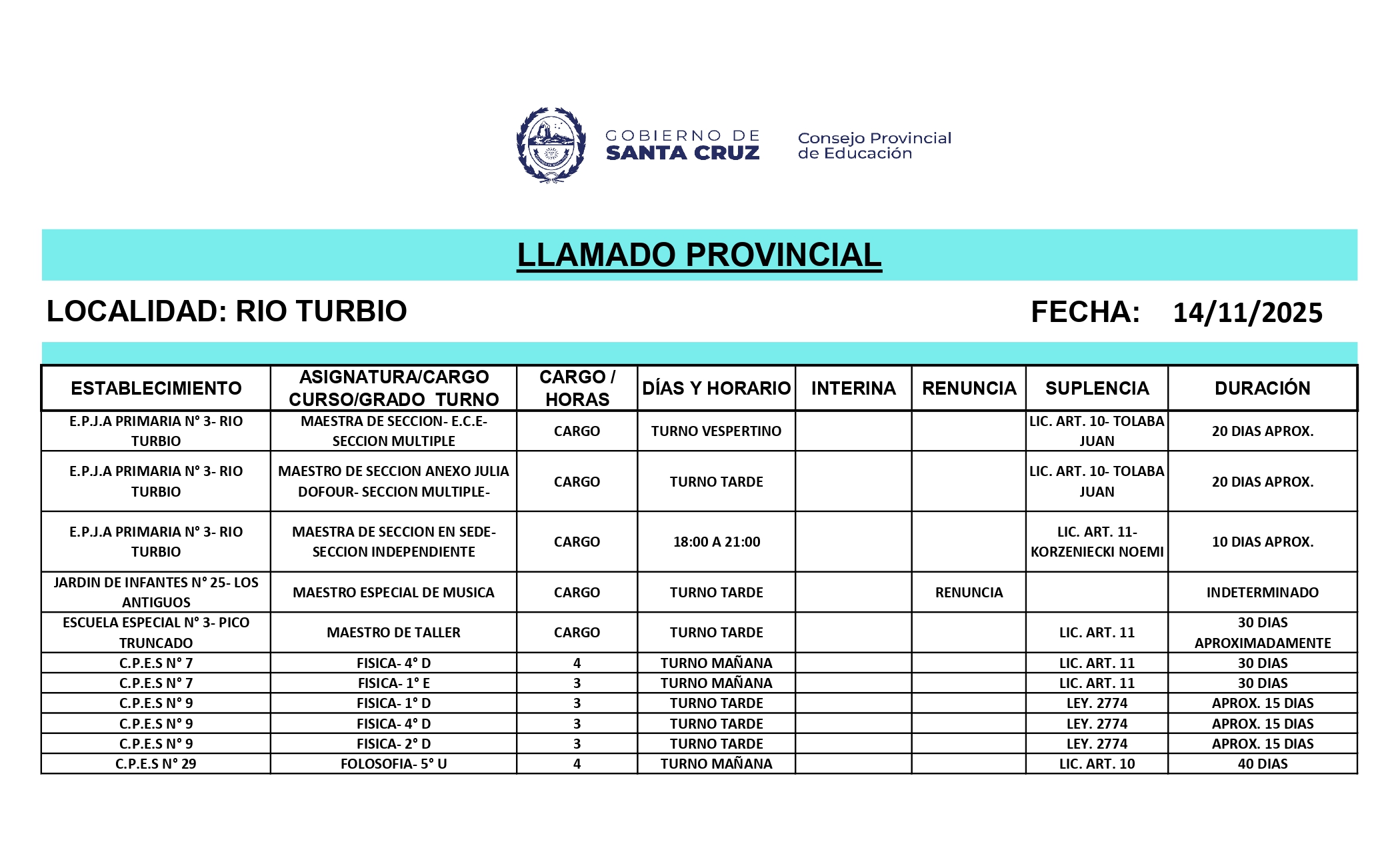 14/11/2025 | El Consejo Provincial de Educación, a través de las Comisiones de Ofrecimientos, informa que se encuentran disponibles los listados para acceder a los cargos y horas cátedra en establecimientos de diferentes localidades. Los mismos se realizarán de manera presencial.