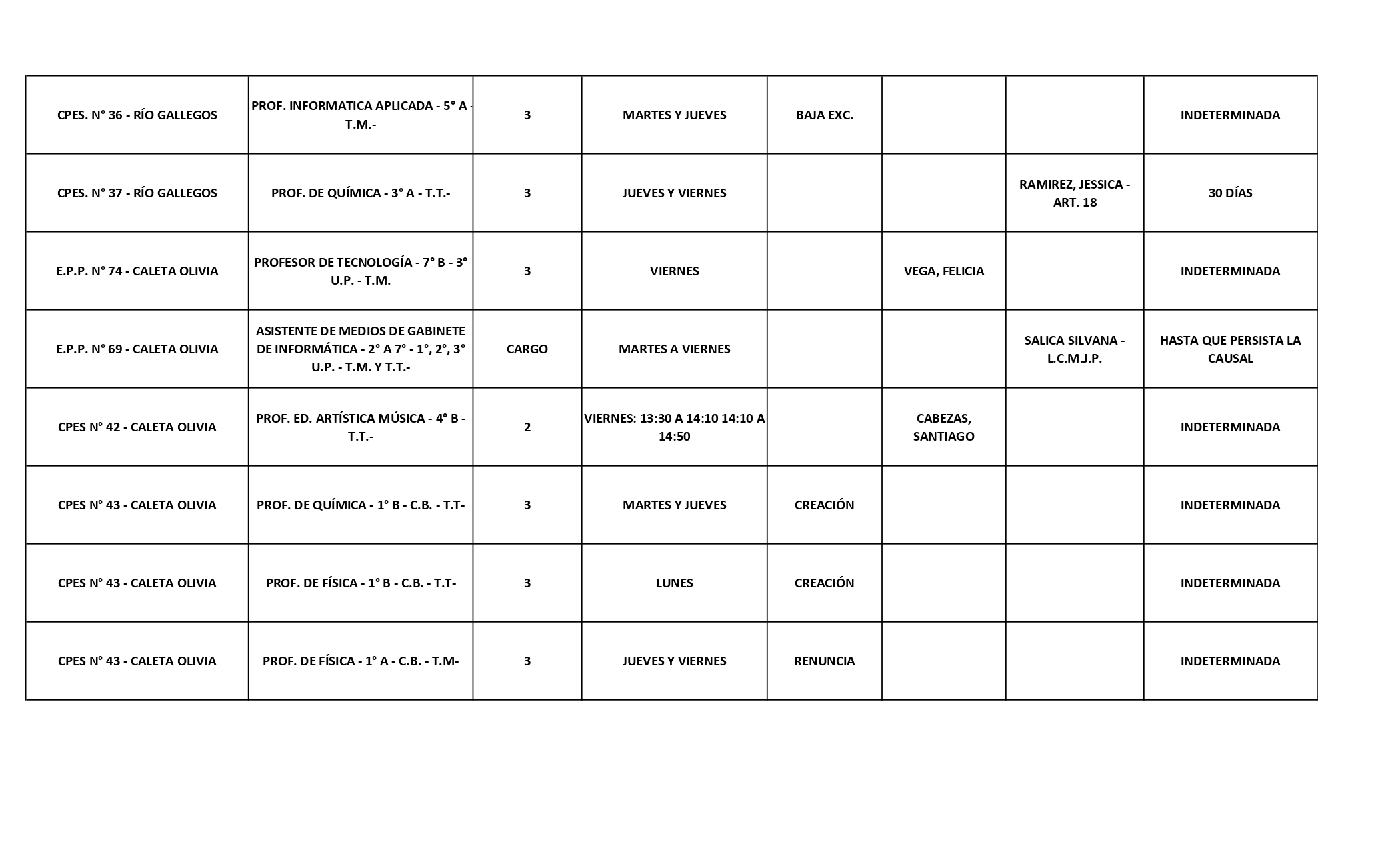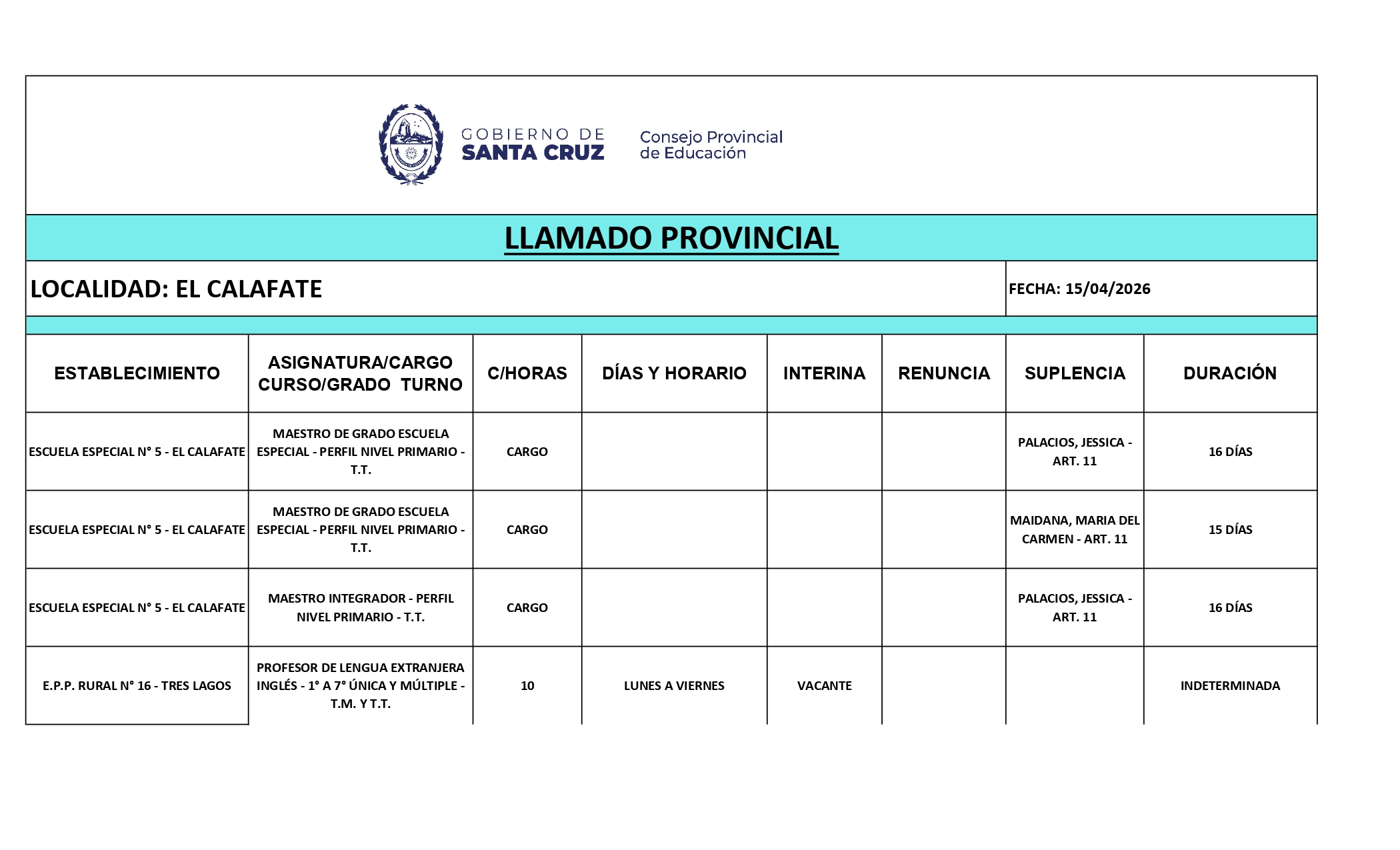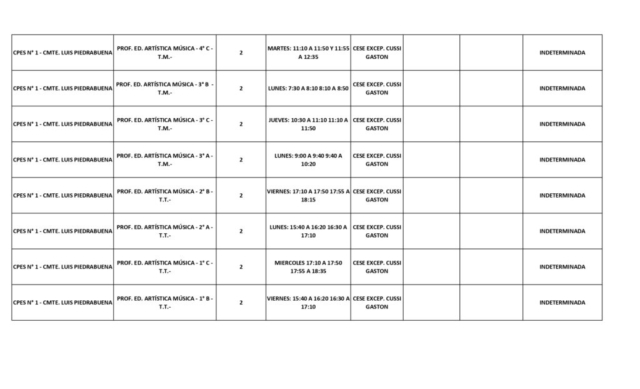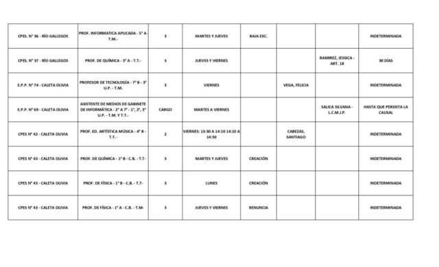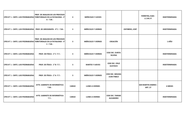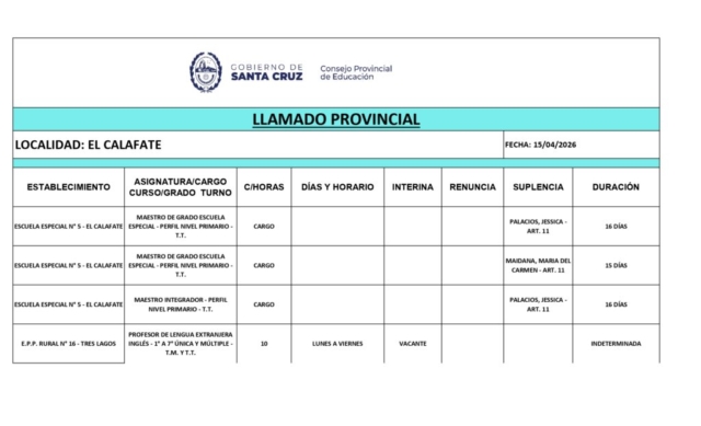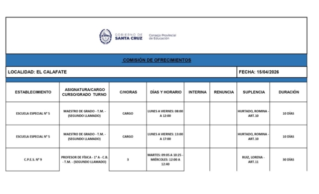 15/04/2026 | El Consejo Provincial de Educación, a través de las Comisiones de Ofrecimientos, informa que se encuentran disponibles los listados para acceder a los cargos y horas cátedra en establecimientos de diferentes localidades. Los mismos se realizarán de manera presencial.