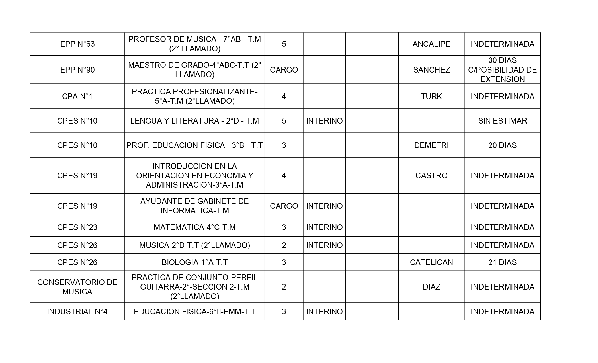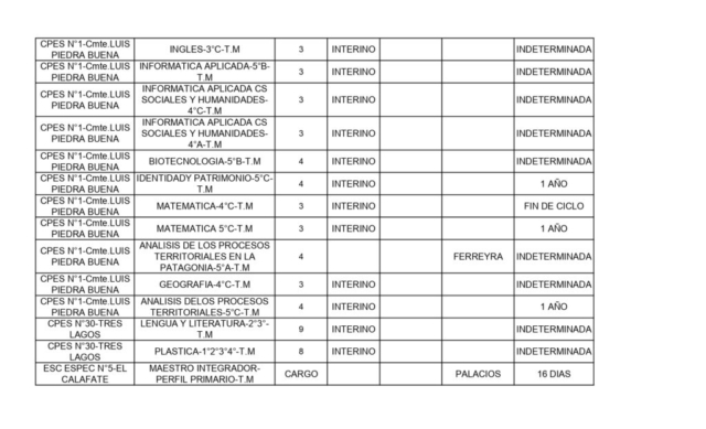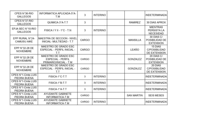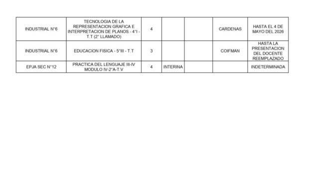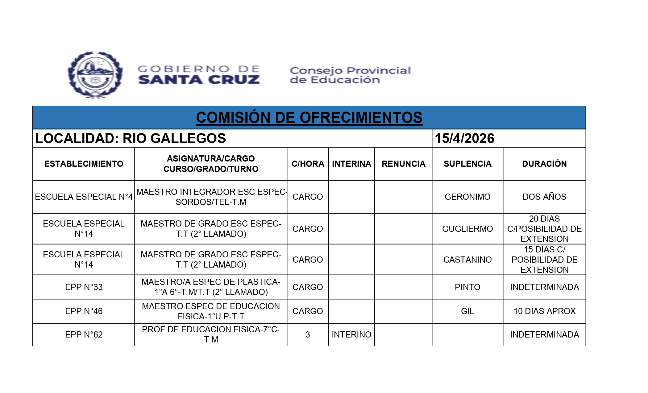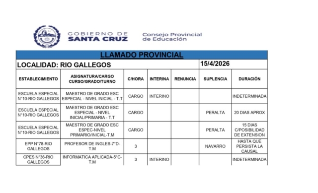 15/04/2026 | El Consejo Provincial de Educación, a través de las Comisiones de Ofrecimientos, informa que se encuentran disponibles los listados para acceder a los cargos y horas cátedra en establecimientos de diferentes localidades. Los mismos se realizarán de manera presencial.