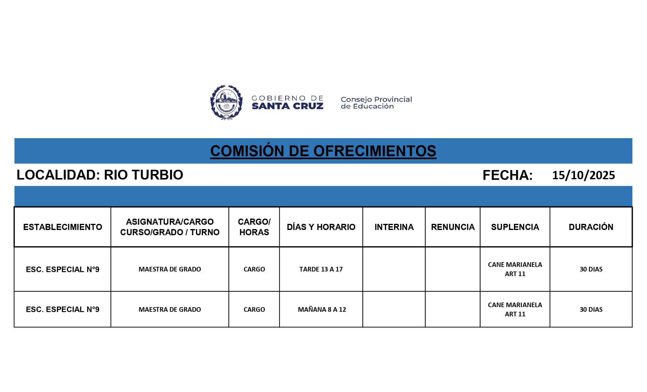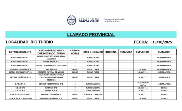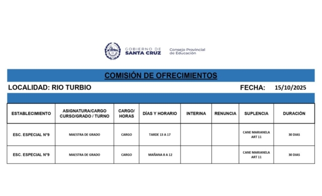 15/10/2025 | El Consejo Provincial de Educación, a través de las Comisiones de Ofrecimientos, informa que se encuentran disponibles los listados para acceder a los cargos y horas cátedra en establecimientos de diferentes localidades. Los mismos se realizarán de manera presencial.