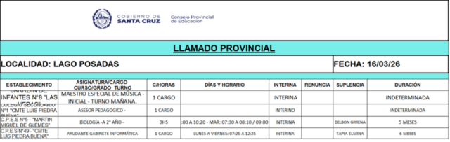 16/03/2026 | El Consejo Provincial de Educación, a través de las Comisiones de Ofrecimientos, informa que se encuentran disponibles los listados para acceder a los cargos y horas cátedra en establecimientos de diferentes localidades. Los mismos se realizarán de manera presencial.