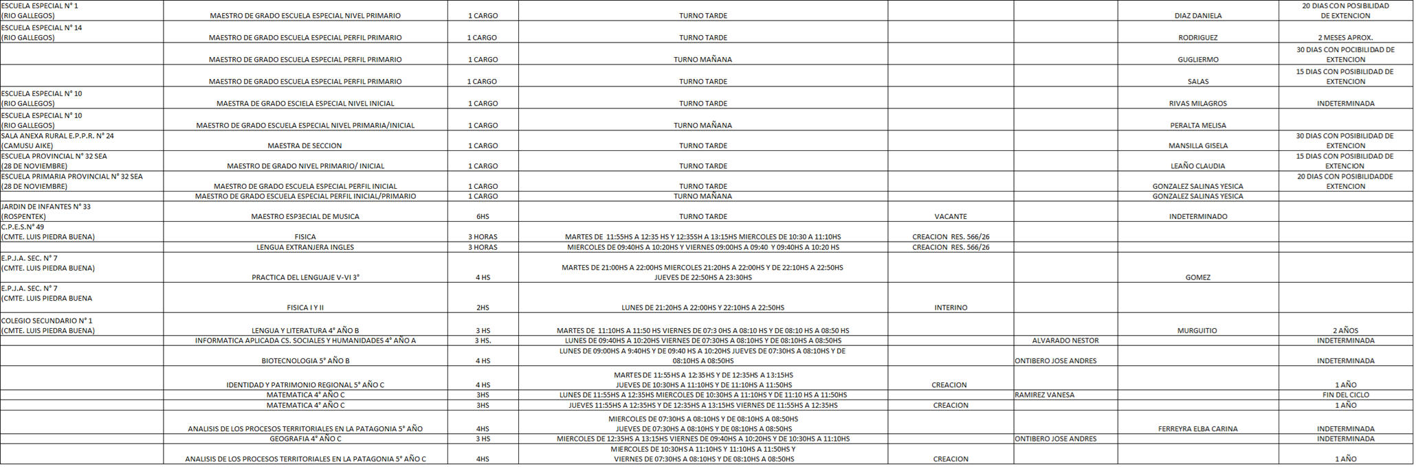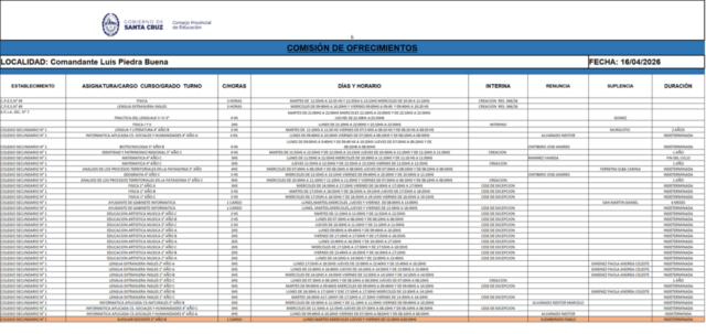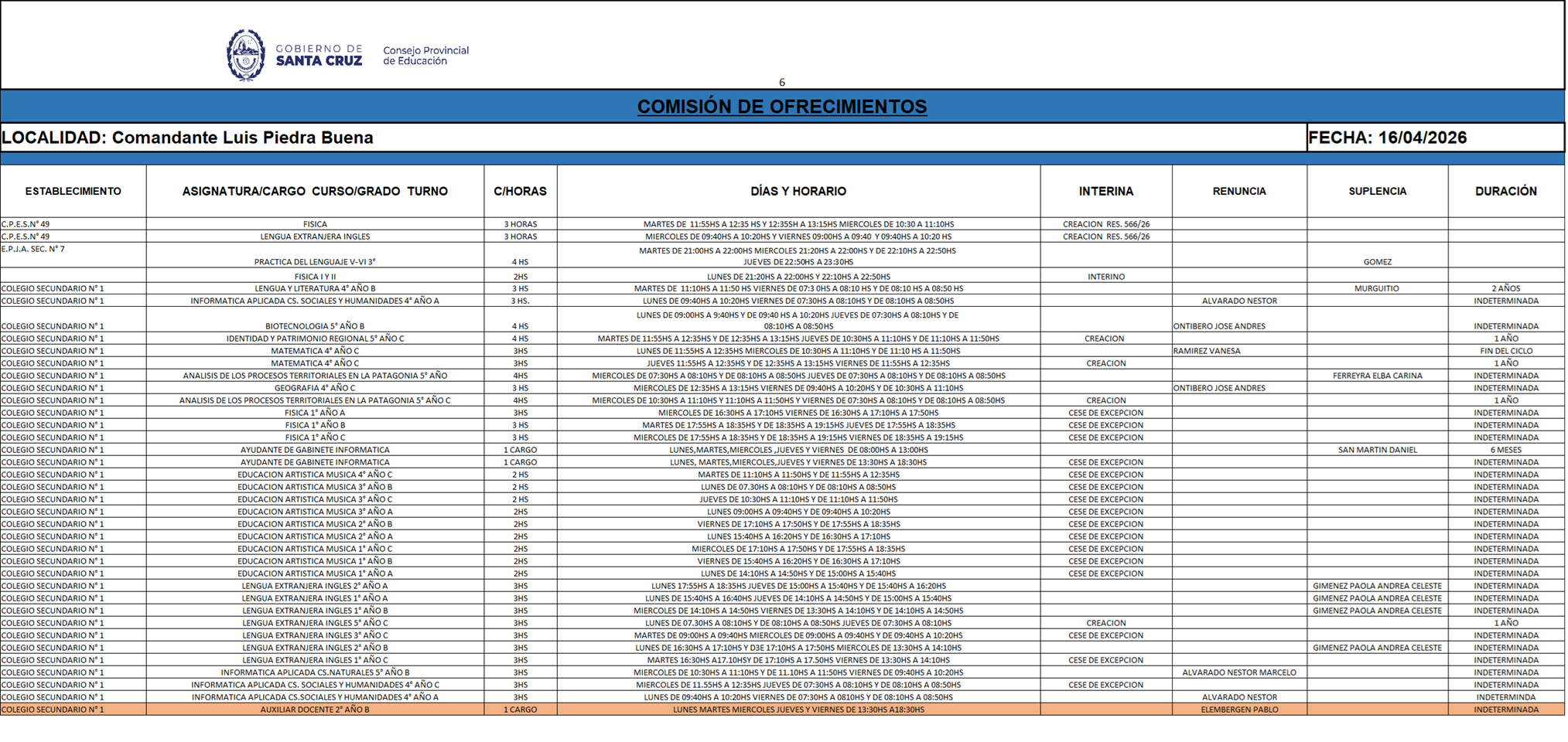 16/04/2026 | El Consejo Provincial de Educación, a través de las Comisiones de Ofrecimientos, informa que se encuentran disponibles los listados para acceder a los cargos y horas cátedra en establecimientos de diferentes localidades. Los mismos se realizarán de manera presencial.