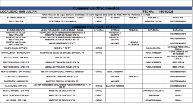 16/04/2026 | El Consejo Provincial de Educación, a través de las Comisiones de Ofrecimientos, informa que se encuentran disponibles los listados para acceder a los cargos y horas cátedra en establecimientos de diferentes localidades. Los mismos se realizarán de manera presencial.