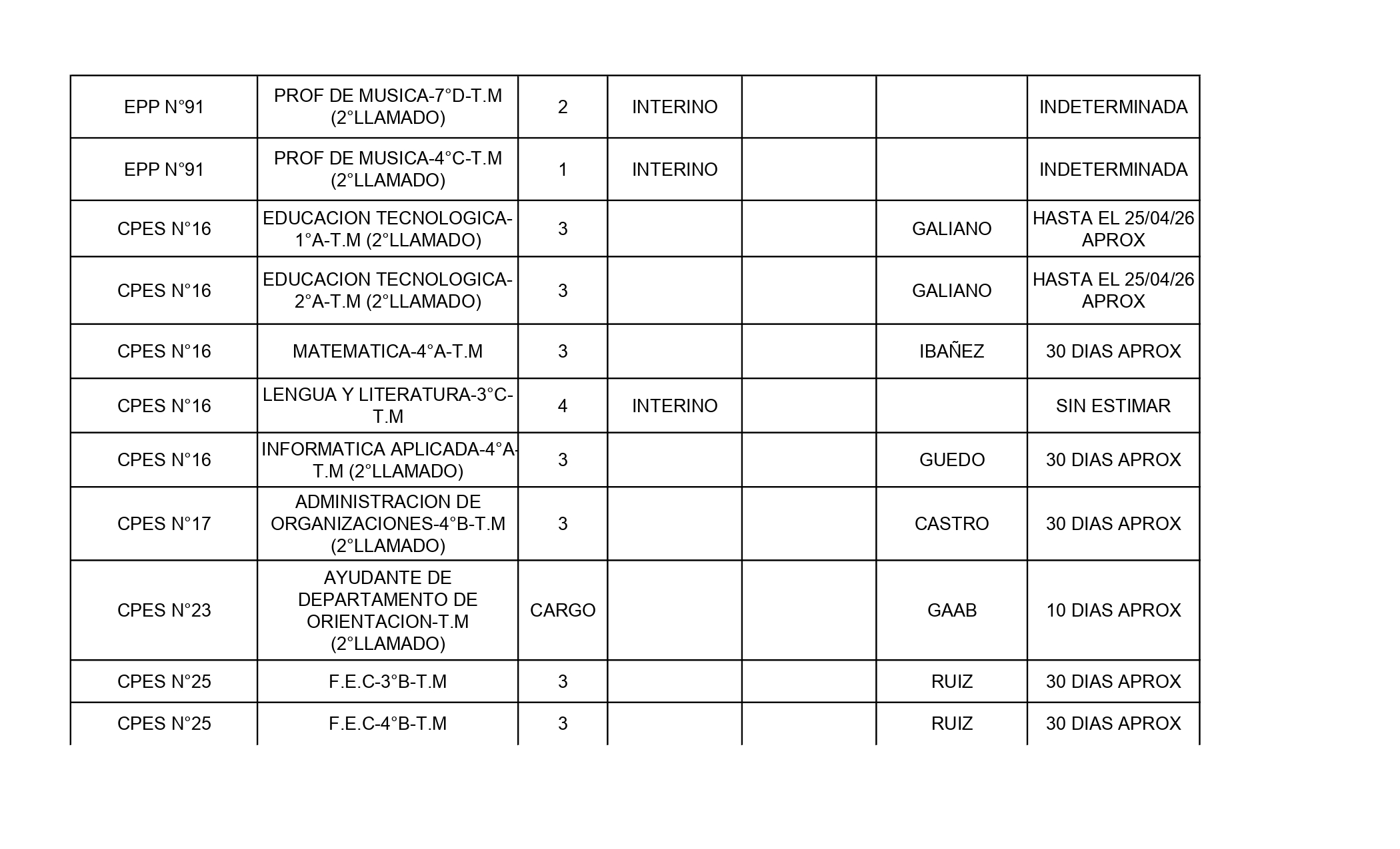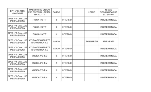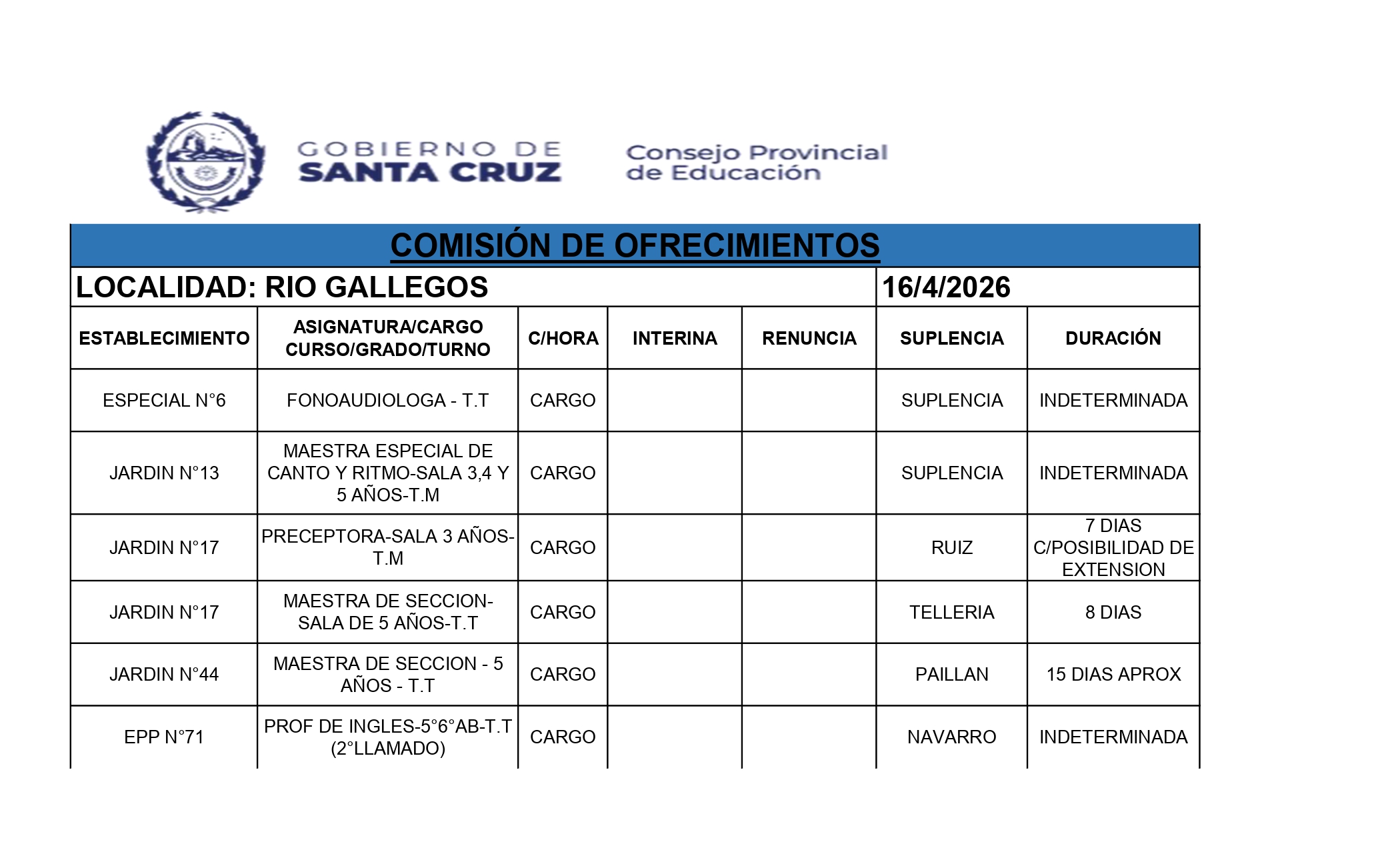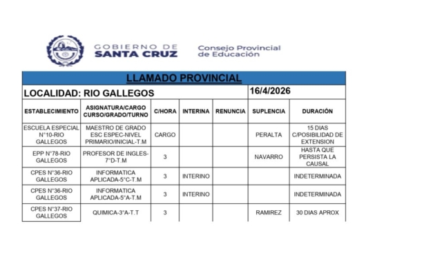 16/04/2026 | El Consejo Provincial de Educación, a través de las Comisiones de Ofrecimientos, informa que se encuentran disponibles los listados para acceder a los cargos y horas cátedra en establecimientos de diferentes localidades. Los mismos se realizarán de manera presencial.