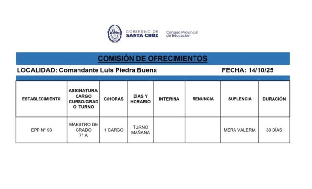 16/10/2025 | El Consejo Provincial de Educación, a través de las Comisiones de Ofrecimientos, informa que se encuentran disponibles los listados para acceder a los cargos y horas cátedra en establecimientos de diferentes localidades. Los mismos se realizarán de manera presencial.
