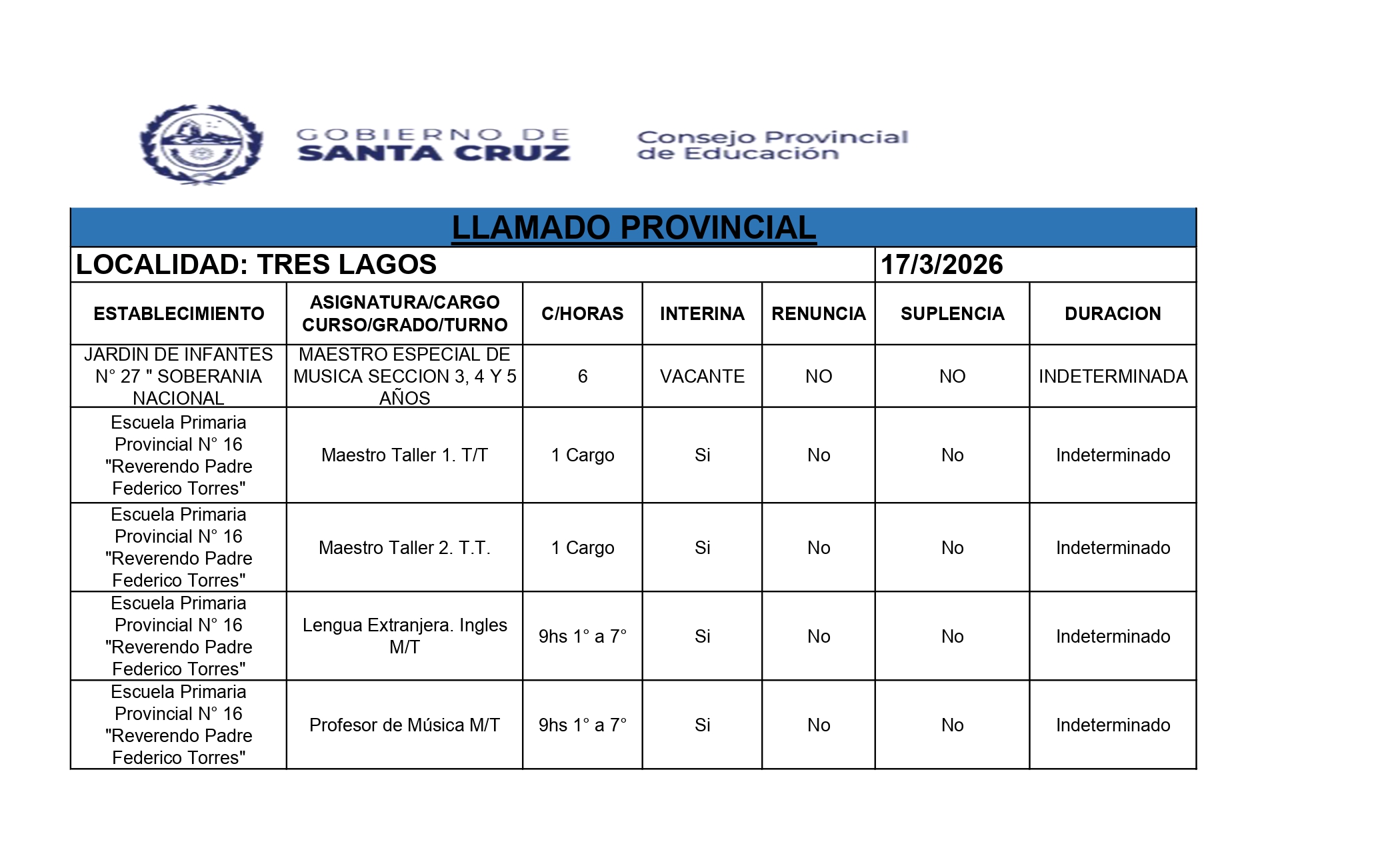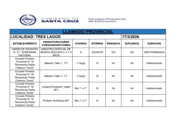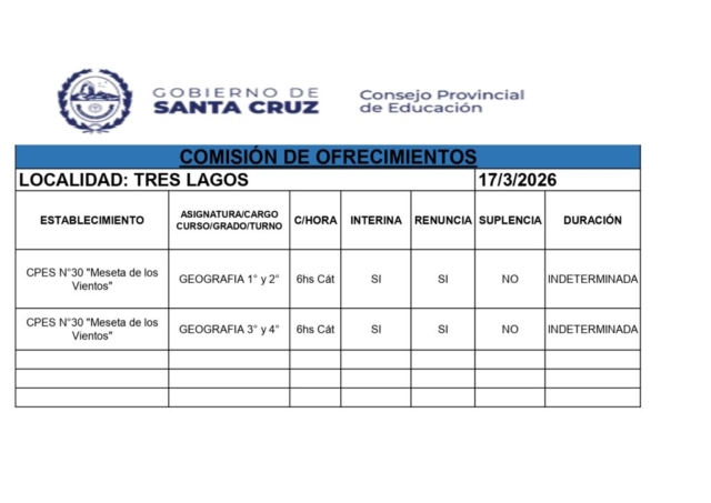 17/03/2026 | El Consejo Provincial de Educación, a través de las Comisiones de Ofrecimientos, informa que se encuentran disponibles los listados para acceder a los cargos y horas cátedra en establecimientos de diferentes localidades. Los mismos se realizarán de manera presencial.