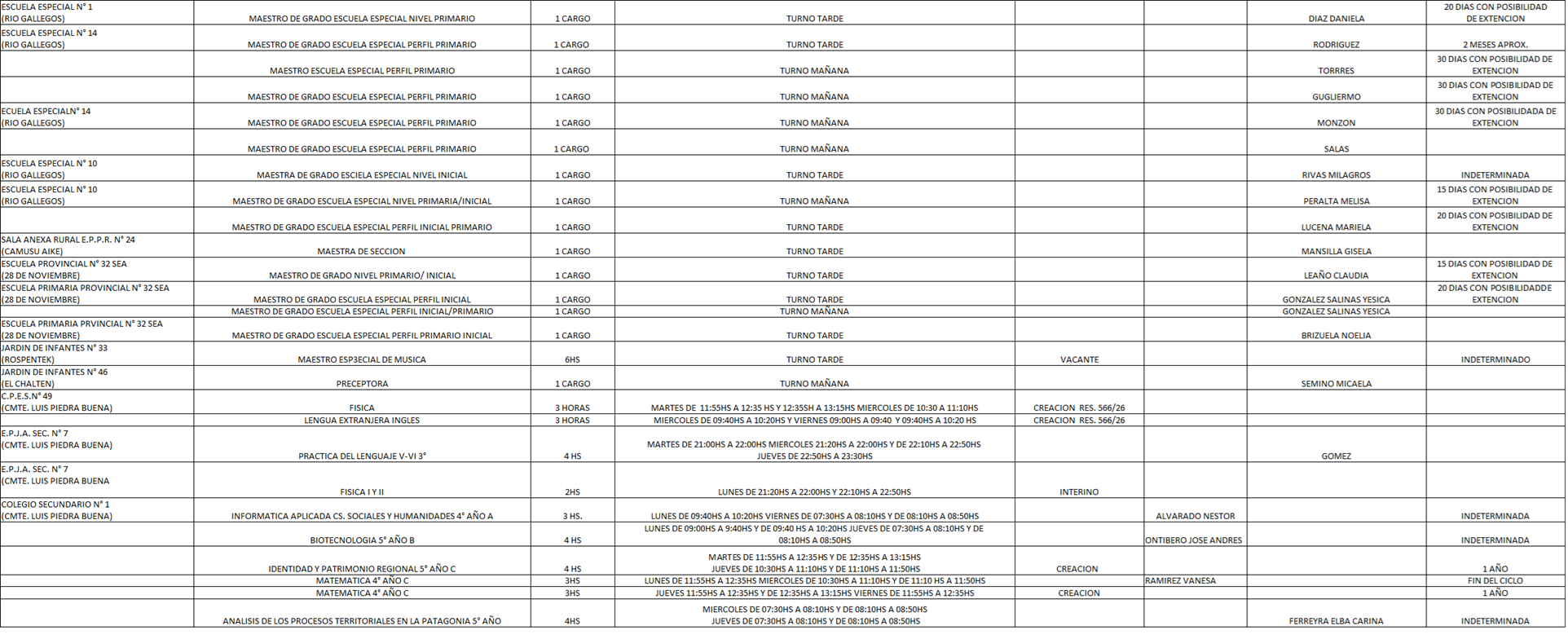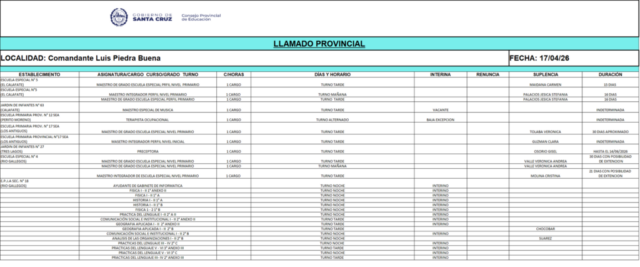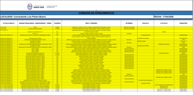 17/04/2026 | El Consejo Provincial de Educación, a través de las Comisiones de Ofrecimientos, informa que se encuentran disponibles los listados para acceder a los cargos y horas cátedra en establecimientos de diferentes localidades. Los mismos se realizarán de manera presencial.
