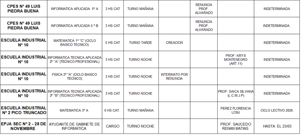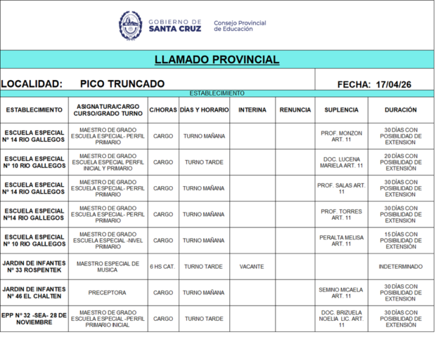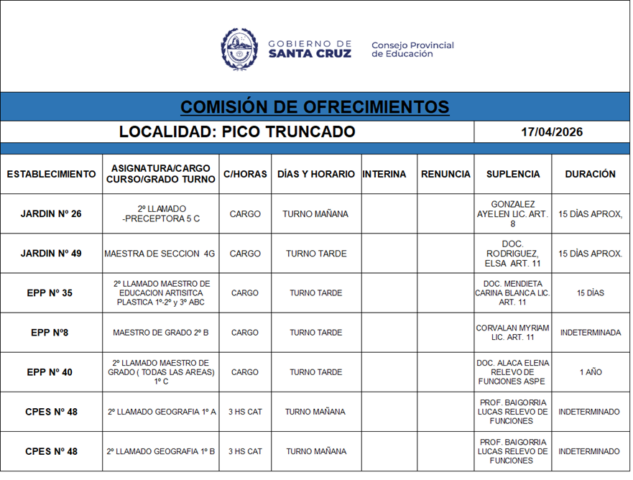 17/04/2026 | El Consejo Provincial de Educación, a través de las Comisiones de Ofrecimientos, informa que se encuentran disponibles los listados para acceder a los cargos y horas cátedra en establecimientos de diferentes localidades. Los mismos se realizarán de manera presencial.