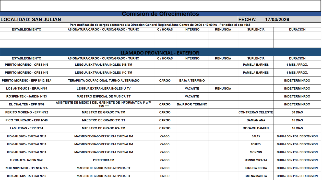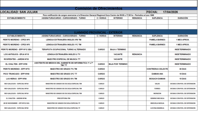 17/04/2026 | El Consejo Provincial de Educación, a través de las Comisiones de Ofrecimientos, informa que se encuentran disponibles los listados para acceder a los cargos y horas cátedra en establecimientos de diferentes localidades. Los mismos se realizarán de manera presencial.