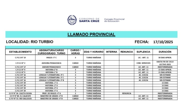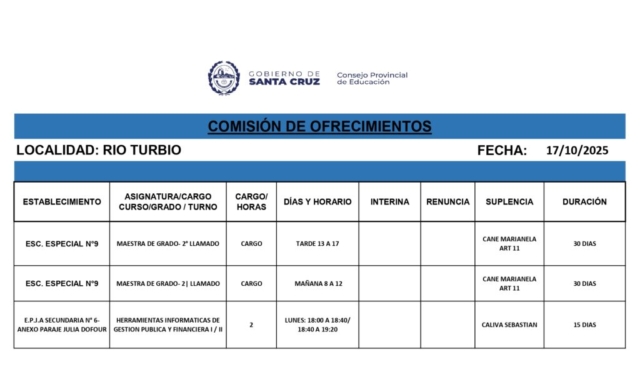 17/10/2025 | El Consejo Provincial de Educación, a través de las Comisiones de Ofrecimientos, informa que se encuentran disponibles los listados para acceder a los cargos y horas cátedra en establecimientos de diferentes localidades. Los mismos se realizarán de manera presencial.
