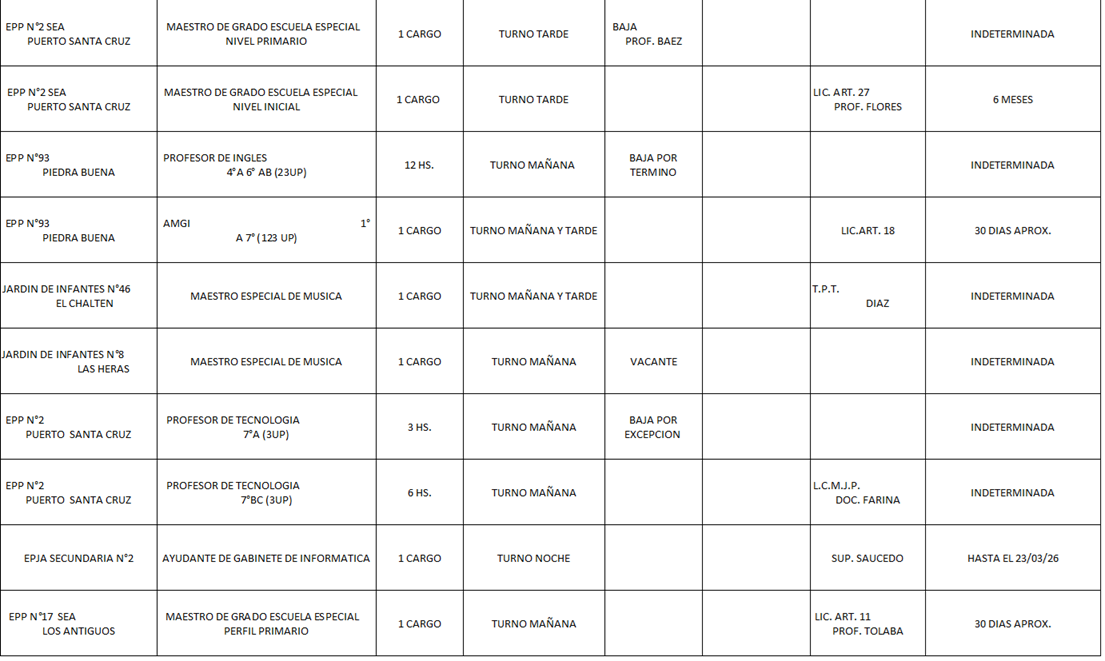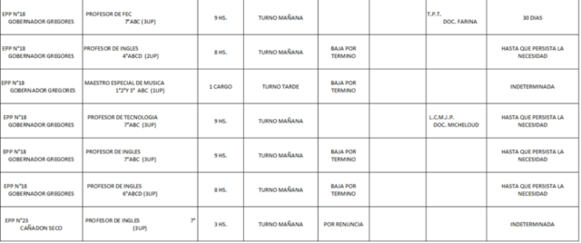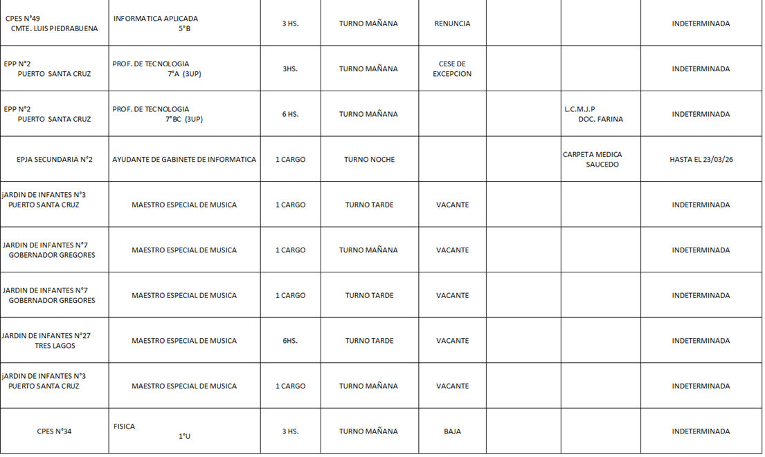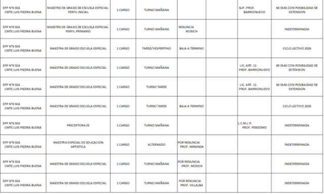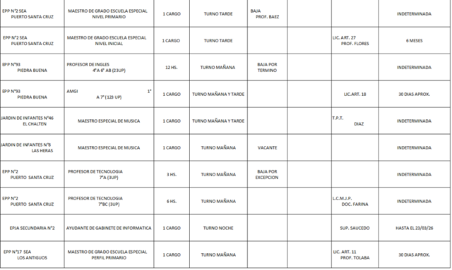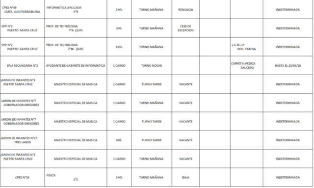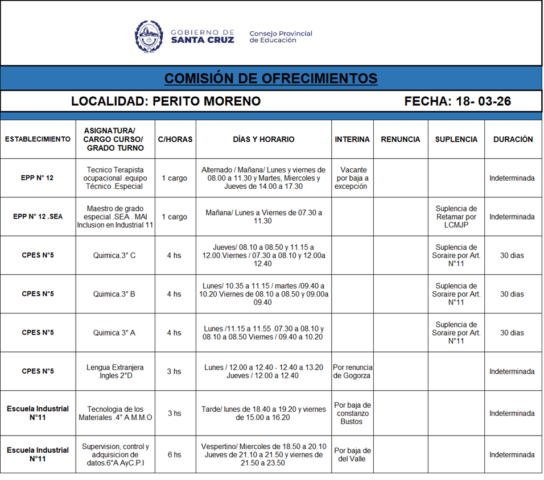 18/03/2026 | El Consejo Provincial de Educación, a través de las Comisiones de Ofrecimientos, informa que se encuentran disponibles los listados para acceder a los cargos y horas cátedra en establecimientos de diferentes localidades. Los mismos se realizarán de manera presencial.