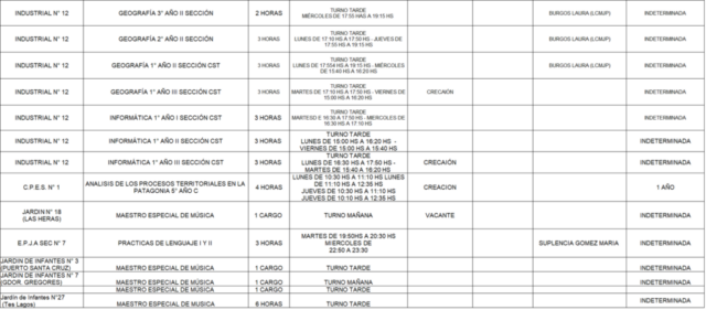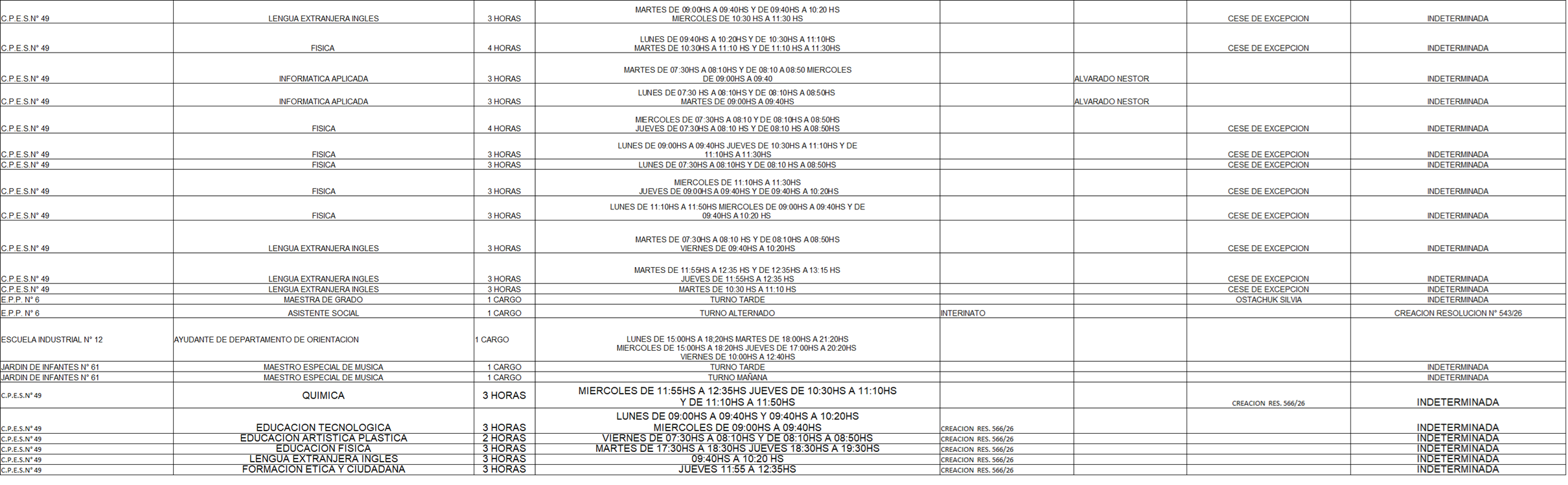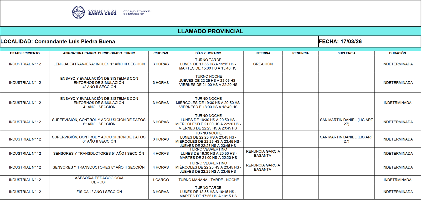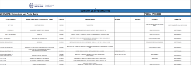 19/03/2026 | El Consejo Provincial de Educación, a través de las Comisiones de Ofrecimientos, informa que se encuentran disponibles los listados para acceder a los cargos y horas cátedra en establecimientos de diferentes localidades. Los mismos se realizarán de manera presencial.