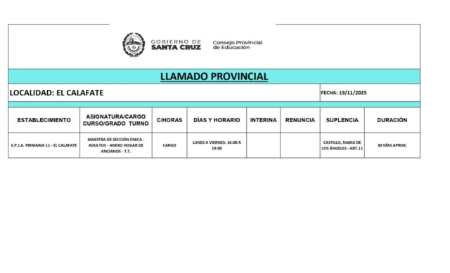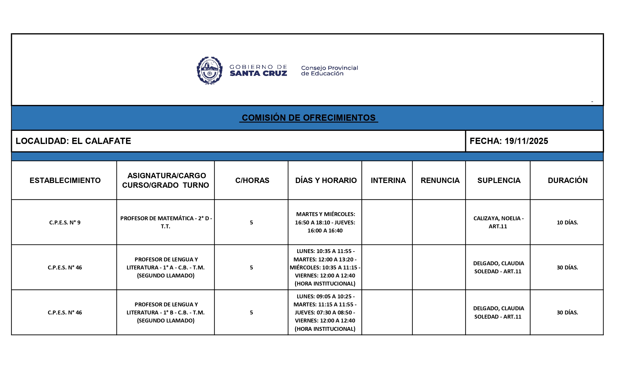 19/11/2025 | El Consejo Provincial de Educación, a través de las Comisiones de Ofrecimientos, informa que se encuentran disponibles los listados para acceder a los cargos y horas cátedra en establecimientos de diferentes localidades. Los mismos se realizarán de manera presencial.