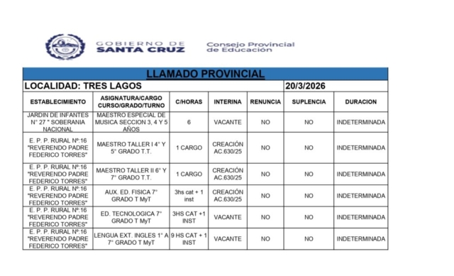 20/03/2026 | El Consejo Provincial de Educación, a través de las Comisiones de Ofrecimientos, informa que se encuentran disponibles los listados para acceder a los cargos y horas cátedra en establecimientos de diferentes localidades. Los mismos se realizarán de manera presencial.