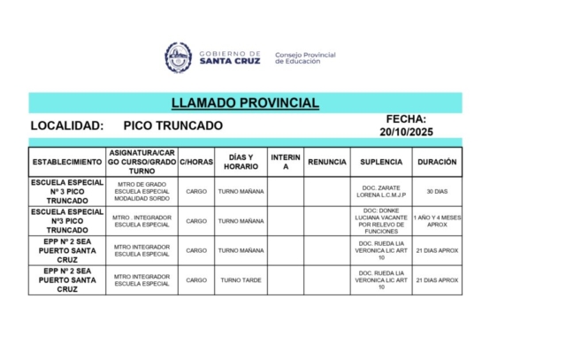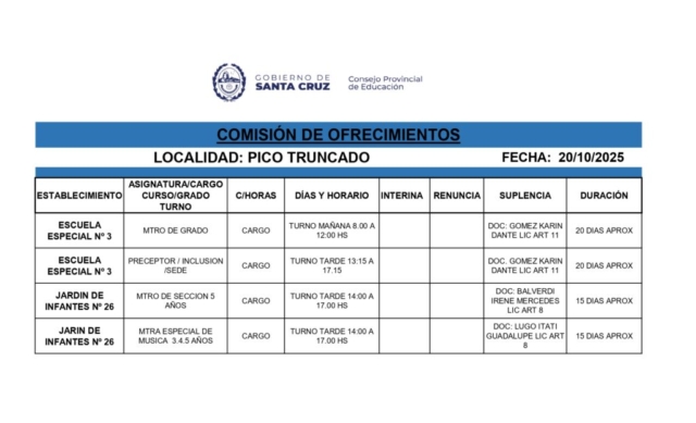 20/10/2025 | El Consejo Provincial de Educación, a través de las Comisiones de Ofrecimientos, informa que se encuentran disponibles los listados para acceder a los cargos y horas cátedra en establecimientos de diferentes localidades. Los mismos se realizarán de manera presencial.