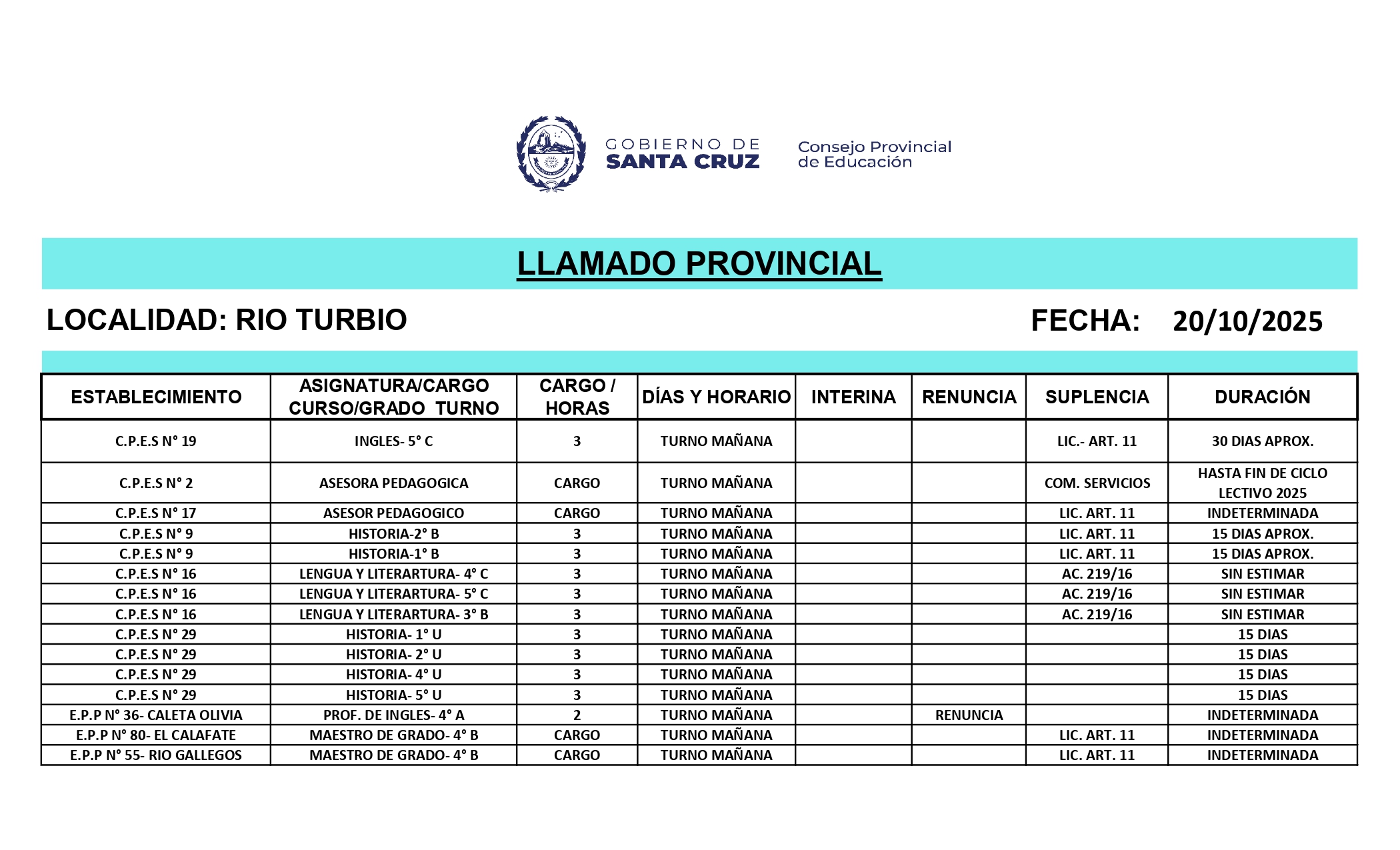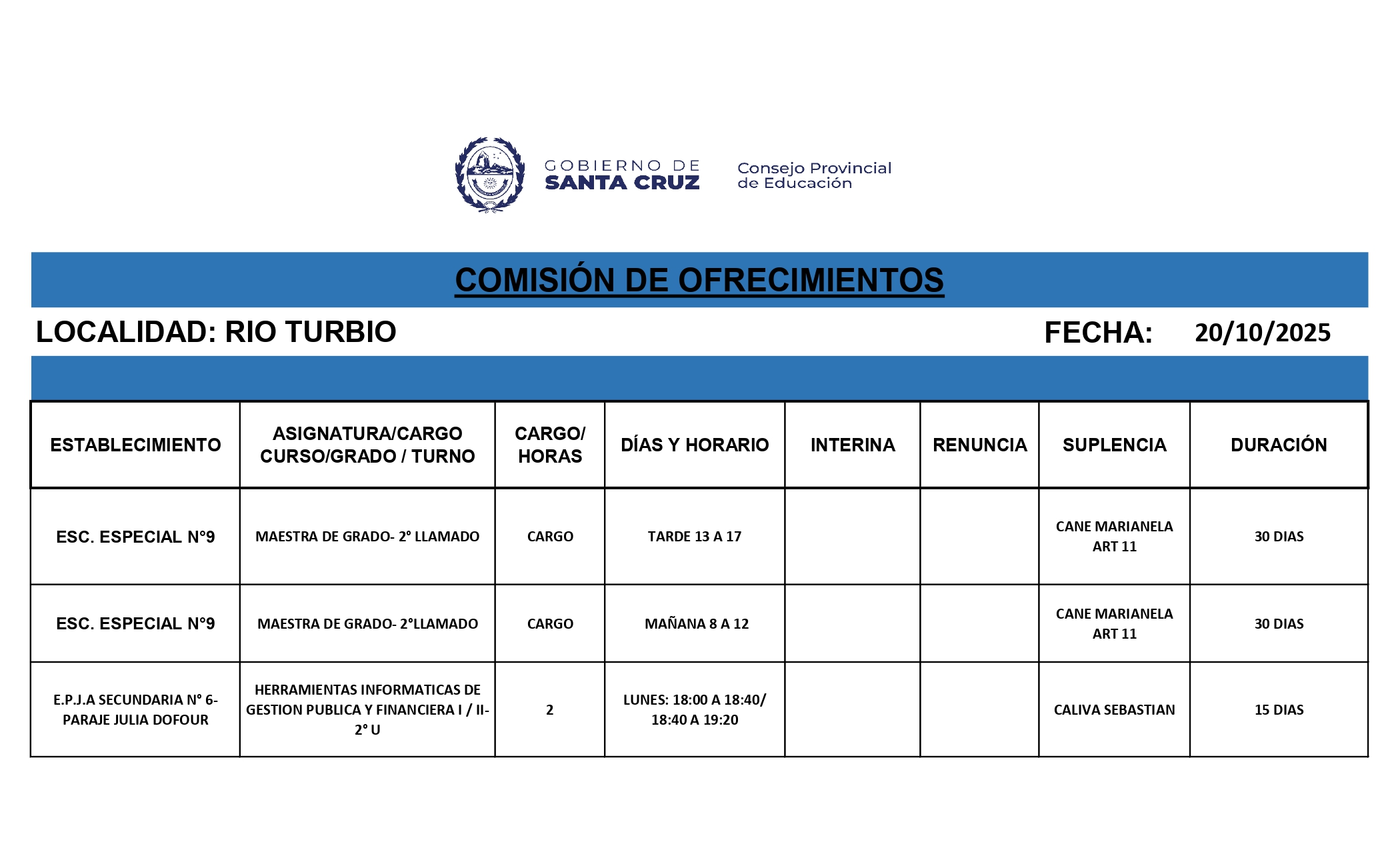 20/10/2025 | El Consejo Provincial de Educación, a través de las Comisiones de Ofrecimientos, informa que se encuentran disponibles los listados para acceder a los cargos y horas cátedra en establecimientos de diferentes localidades. Los mismos se realizarán de manera presencial.
