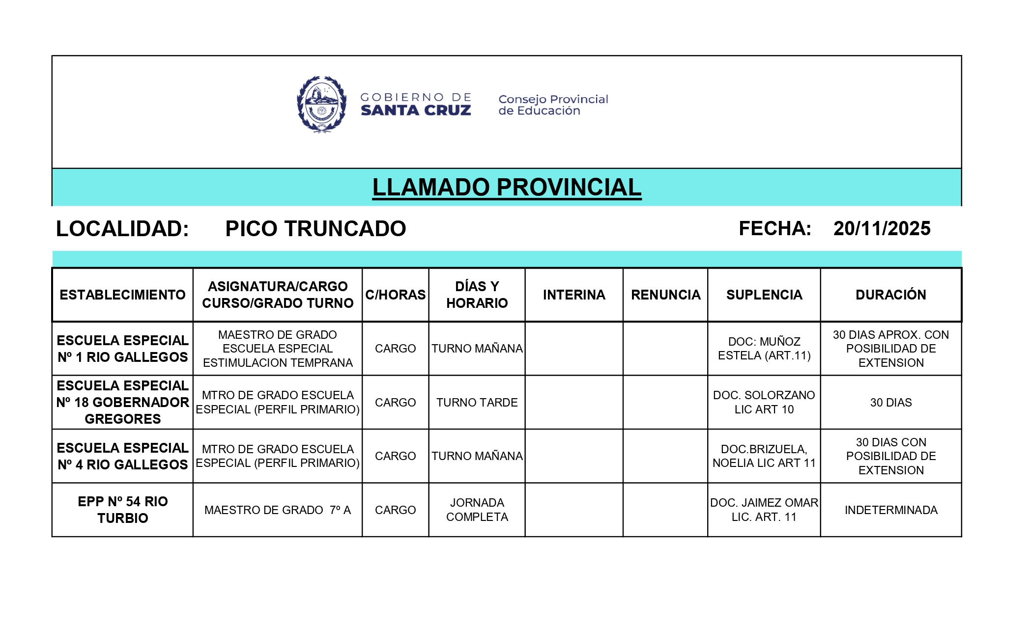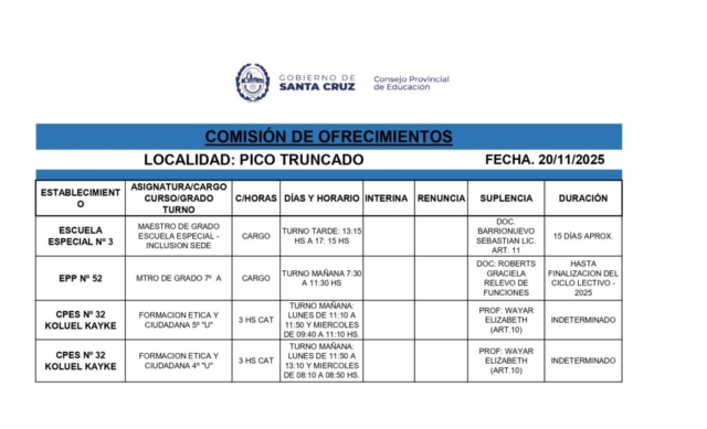 20/11/2025 | El Consejo Provincial de Educación, a través de las Comisiones de Ofrecimientos, informa que se encuentran disponibles los listados para acceder a los cargos y horas cátedra en establecimientos de diferentes localidades. Los mismos se realizarán de manera presencial.