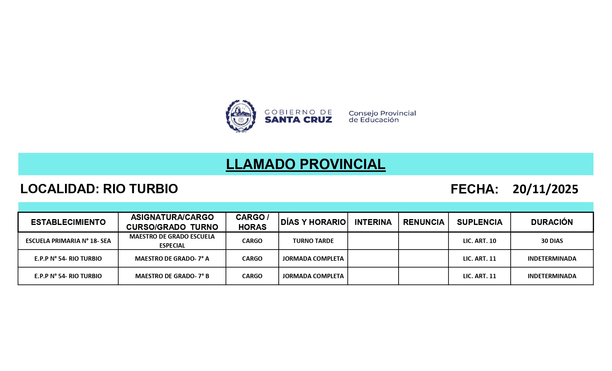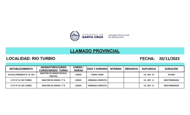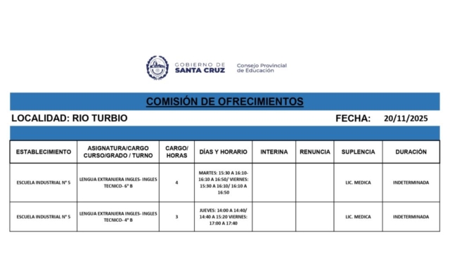 20/11/2025 | El Consejo Provincial de Educación, a través de las Comisiones de Ofrecimientos, informa que se encuentran disponibles los listados para acceder a los cargos y horas cátedra en establecimientos de diferentes localidades. Los mismos se realizarán de manera presencial.
