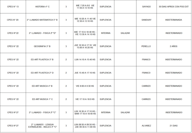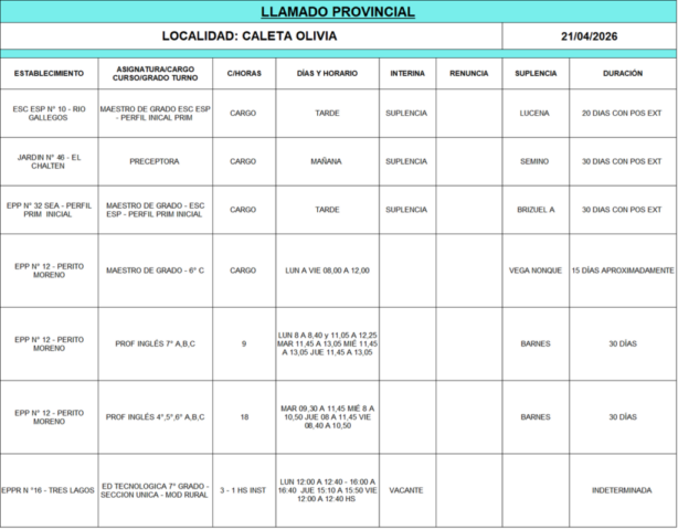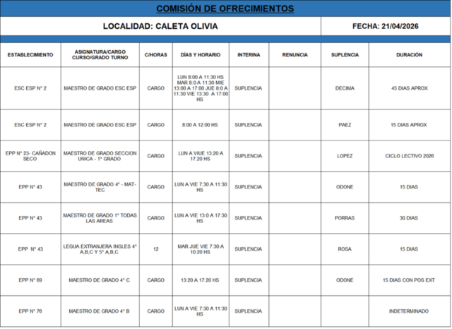 21/04/2026 | El Consejo Provincial de Educación, a través de las Comisiones de Ofrecimientos, informa que se encuentran disponibles los listados para acceder a los cargos y horas cátedra en establecimientos de diferentes localidades. Los mismos se realizarán de manera presencial.