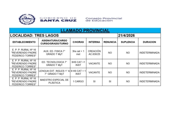 21/04/2026 | El Consejo Provincial de Educación, a través de las Comisiones de Ofrecimientos, informa que se encuentran disponibles los listados para acceder a los cargos y horas cátedra en establecimientos de diferentes localidades. Los mismos se realizarán de manera presencial.