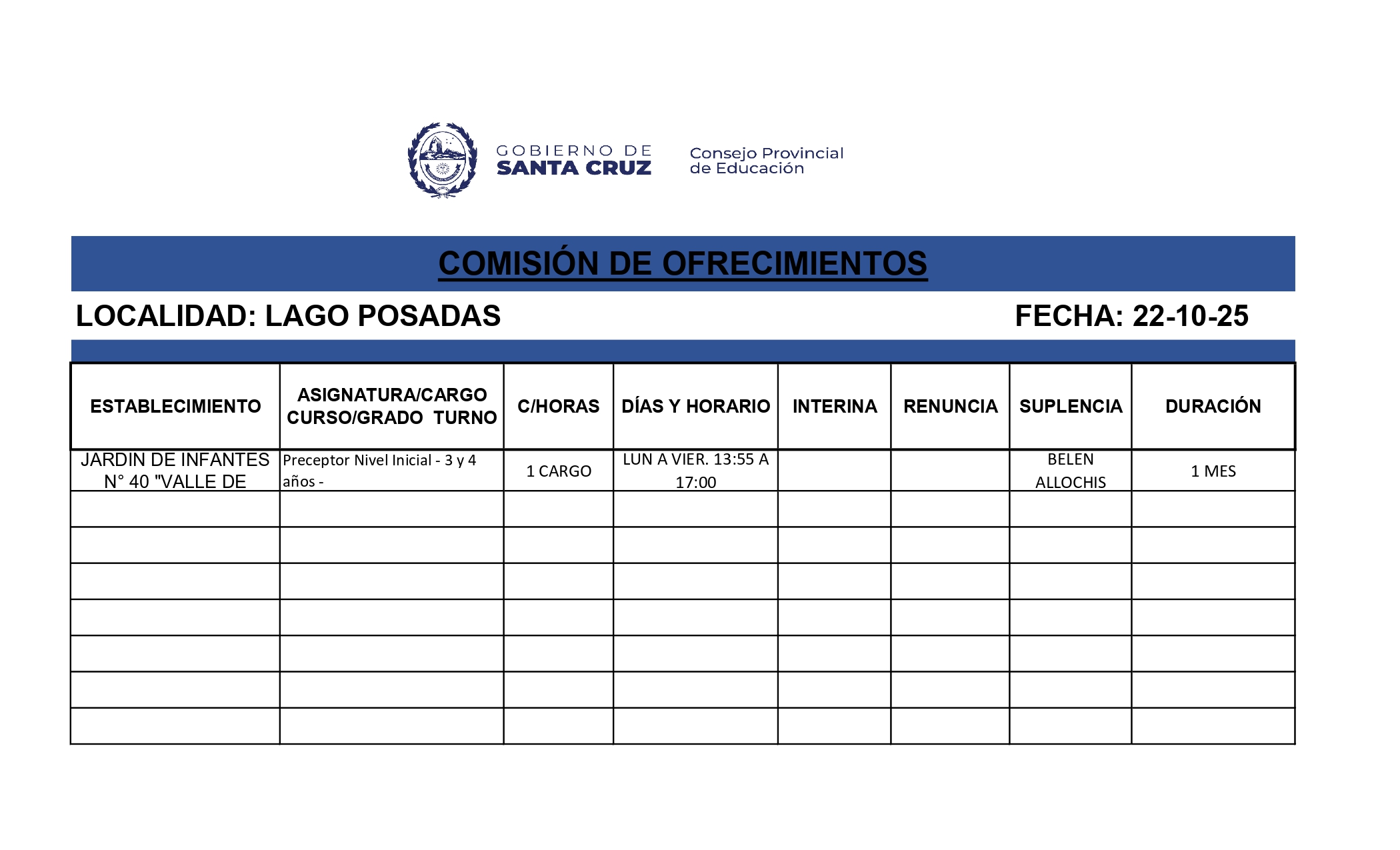 22/10/2025 | El Consejo Provincial de Educación, a través de las Comisiones de Ofrecimientos, informa que se encuentran disponibles los listados para acceder a los cargos y horas cátedra en establecimientos de diferentes localidades. Los mismos se realizarán de manera presencial.