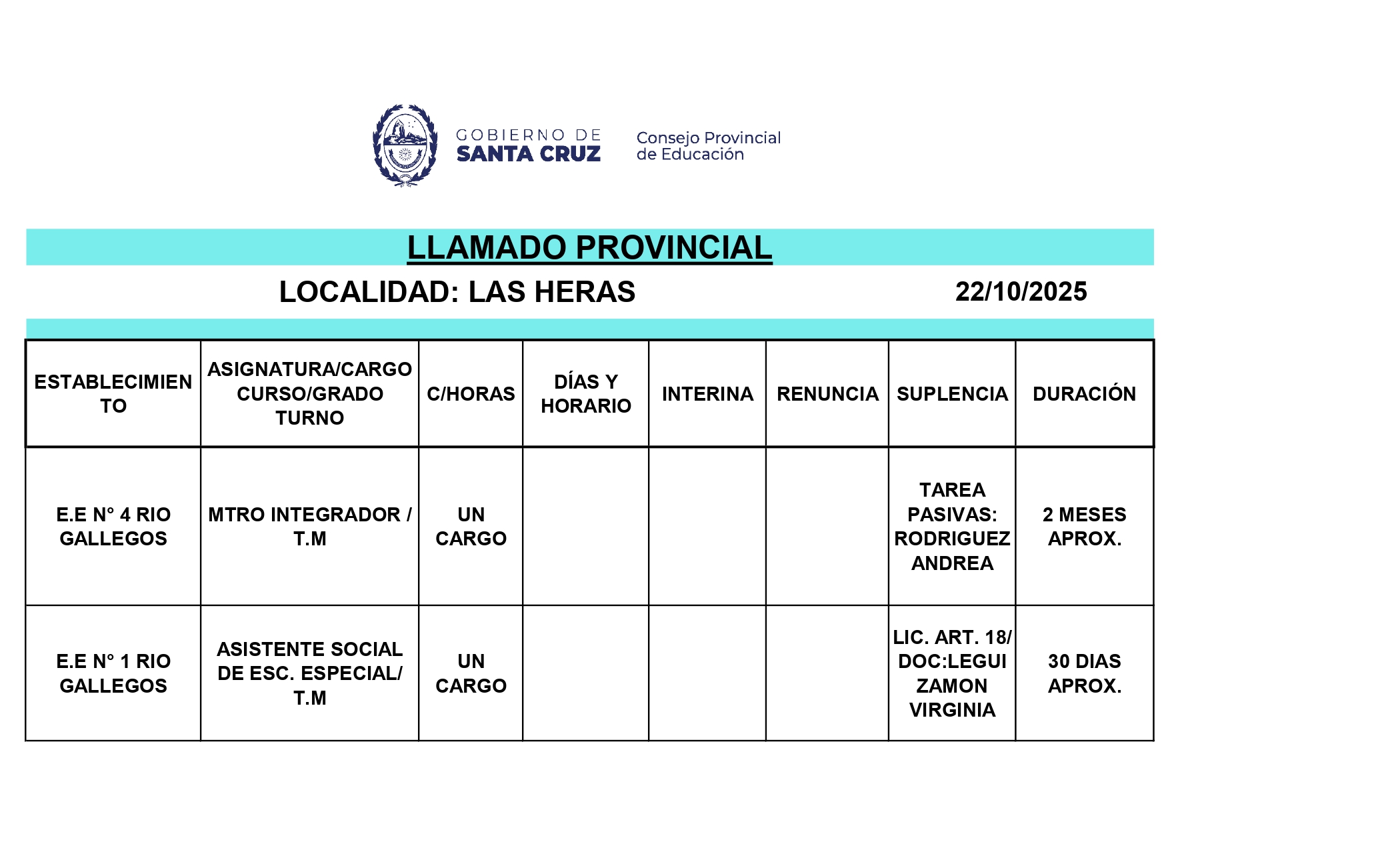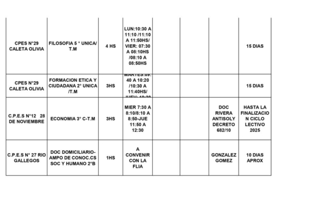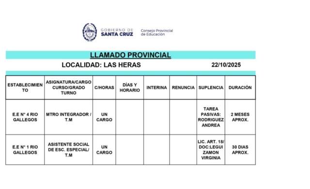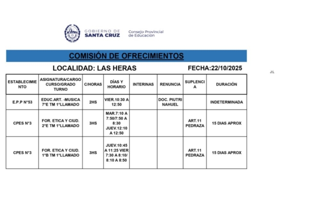 22/10/2025 | El Consejo Provincial de Educación, a través de las Comisiones de Ofrecimientos, informa que se encuentran disponibles los listados para acceder a los cargos y horas cátedra en establecimientos de diferentes localidades. Los mismos se realizarán de manera presencial.