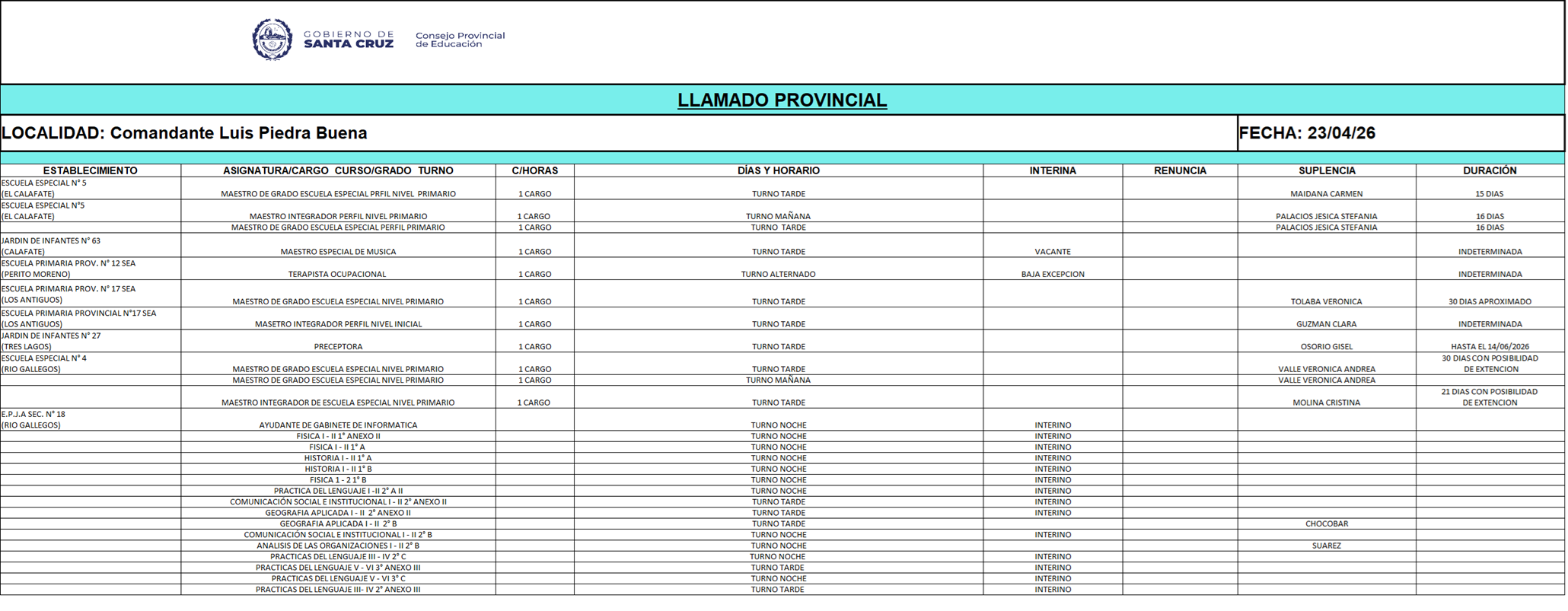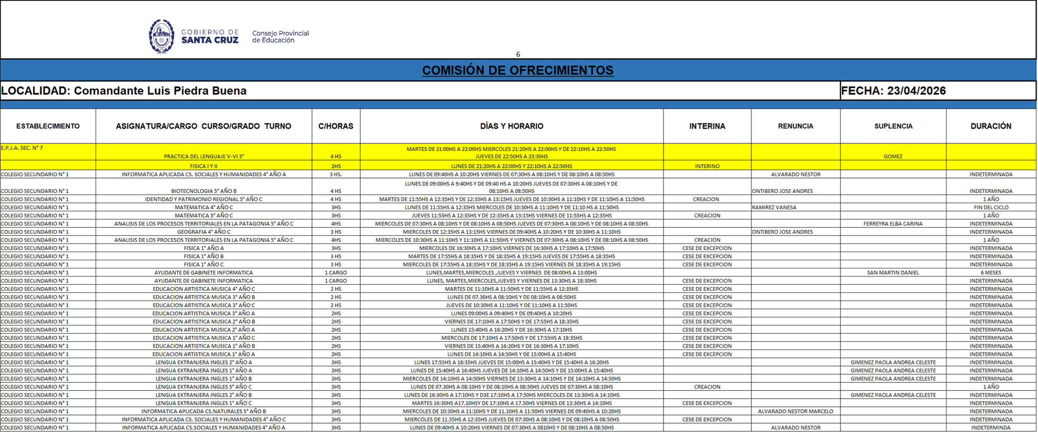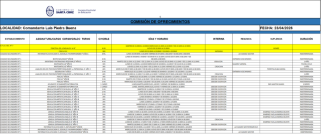 23/04/2026 | El Consejo Provincial de Educación, a través de las Comisiones de Ofrecimientos, informa que se encuentran disponibles los listados para acceder a los cargos y horas cátedra en establecimientos de diferentes localidades. Los mismos se realizarán de manera presencial.