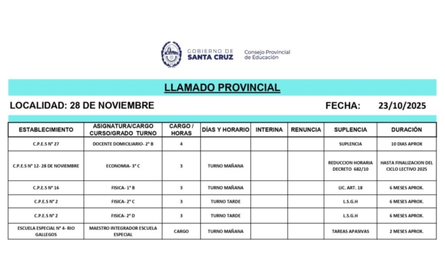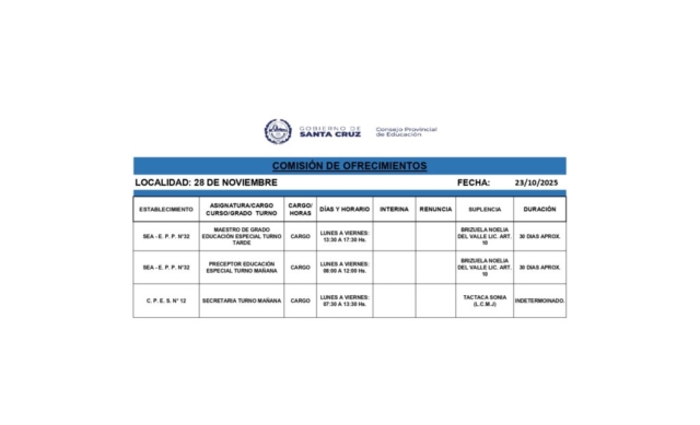 23/10/2025 | El Consejo Provincial de Educación, a través de las Comisiones de Ofrecimientos, informa que se encuentran disponibles los listados para acceder a los cargos y horas cátedra en establecimientos de diferentes localidades. Los mismos se realizarán de manera presencial.