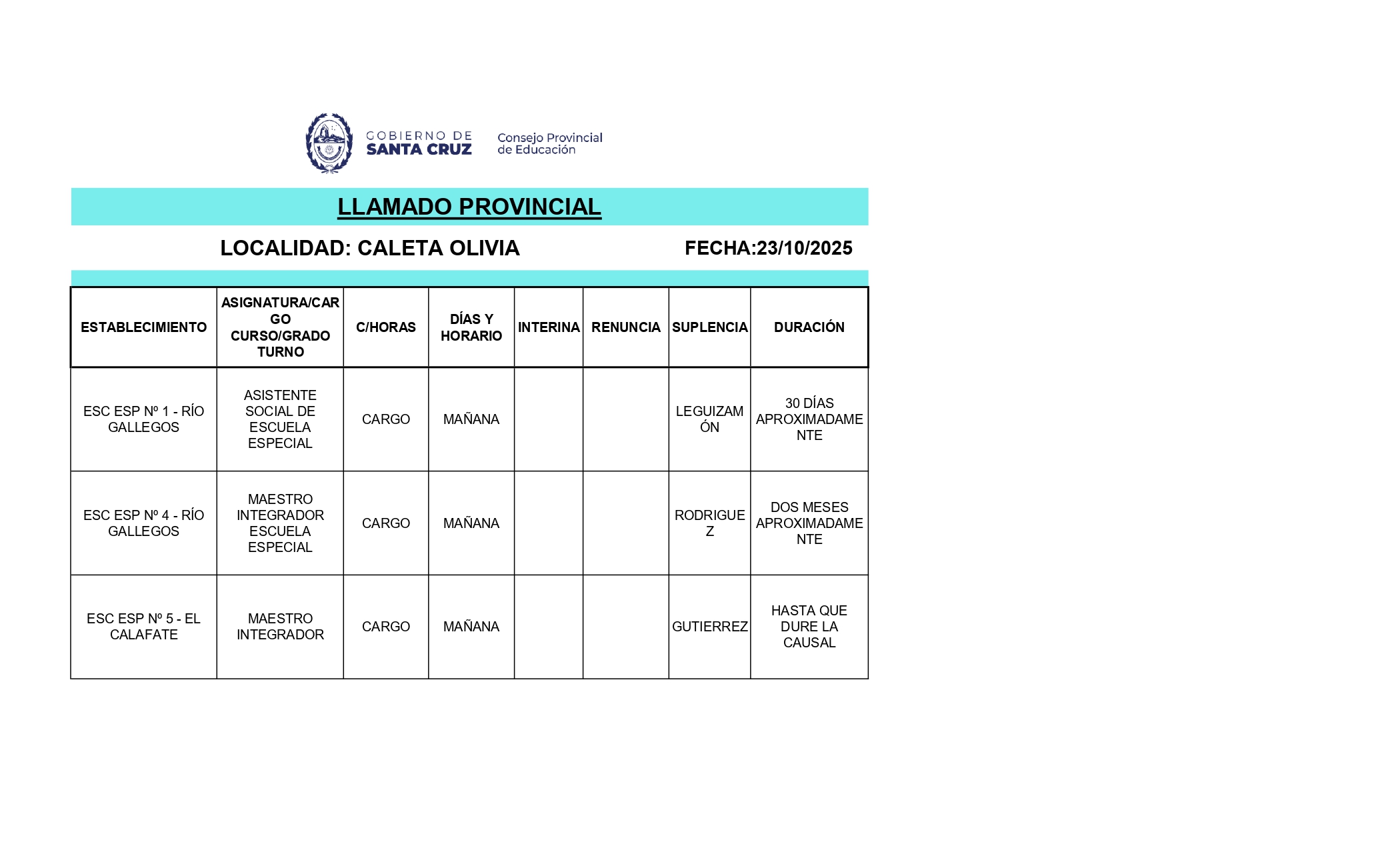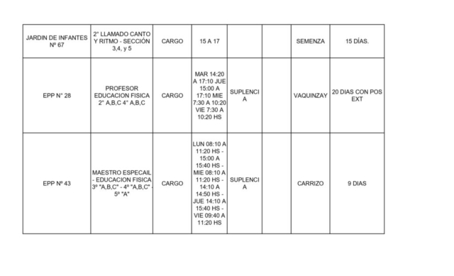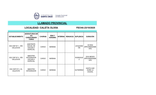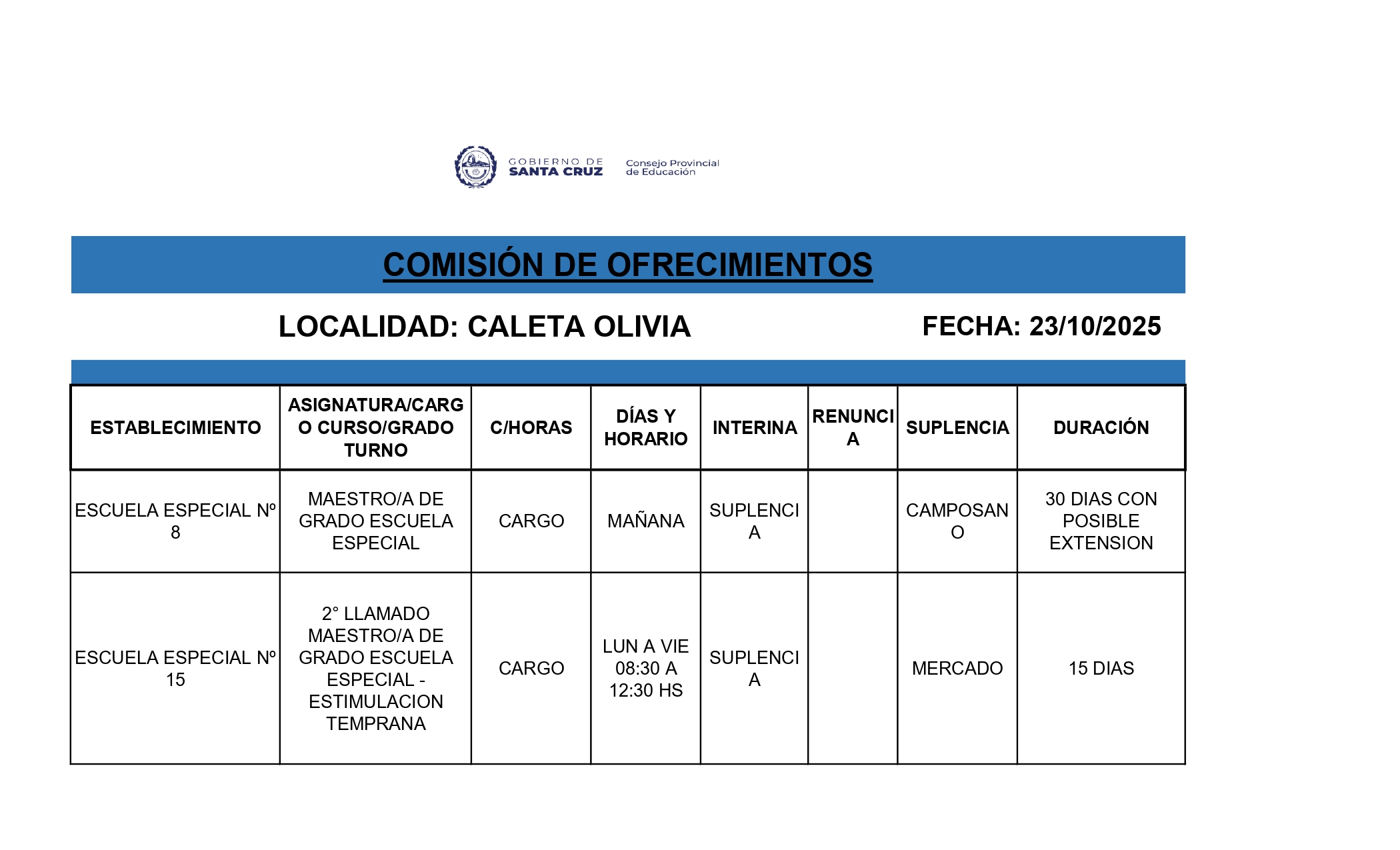 23/10/2025 | El Consejo Provincial de Educación, a través de las Comisiones de Ofrecimientos, informa que se encuentran disponibles los listados para acceder a los cargos y horas cátedra en establecimientos de diferentes localidades. Los mismos se realizarán de manera presencial.