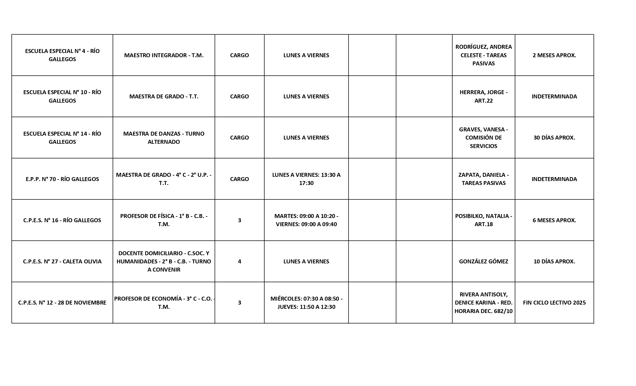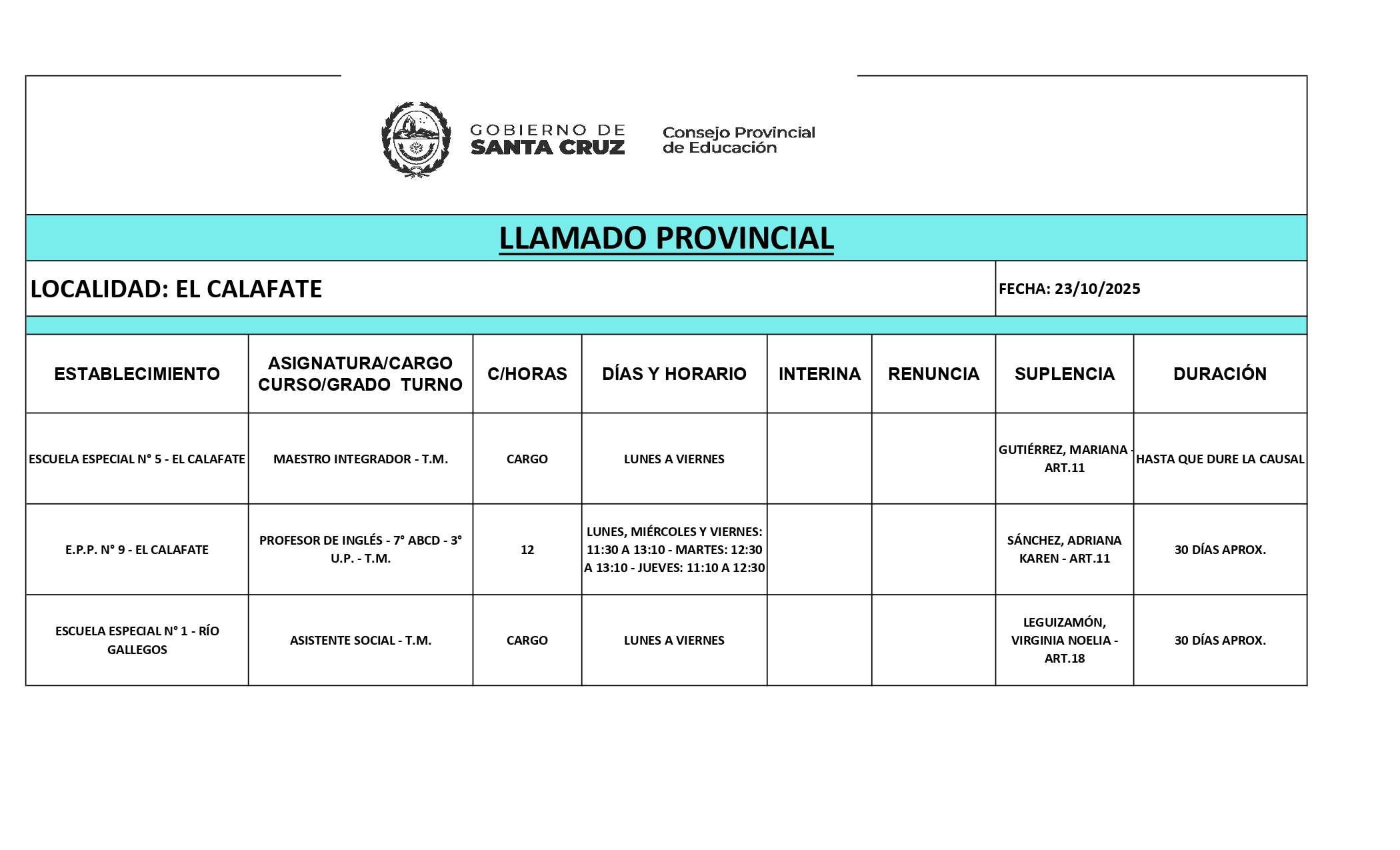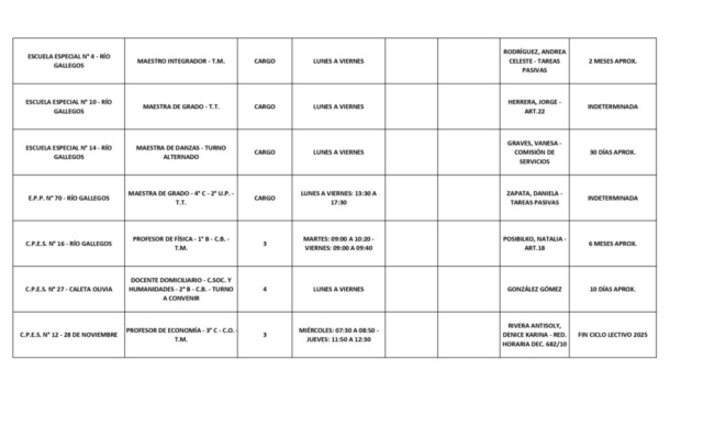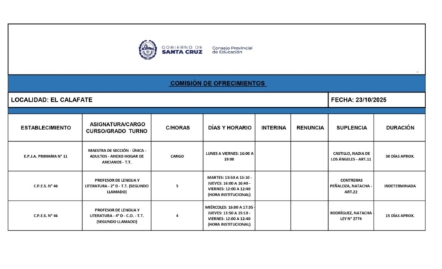 23/10/2025 | El Consejo Provincial de Educación, a través de las Comisiones de Ofrecimientos, informa que se encuentran disponibles los listados para acceder a los cargos y horas cátedra en establecimientos de diferentes localidades. Los mismos se realizarán de manera presencial.