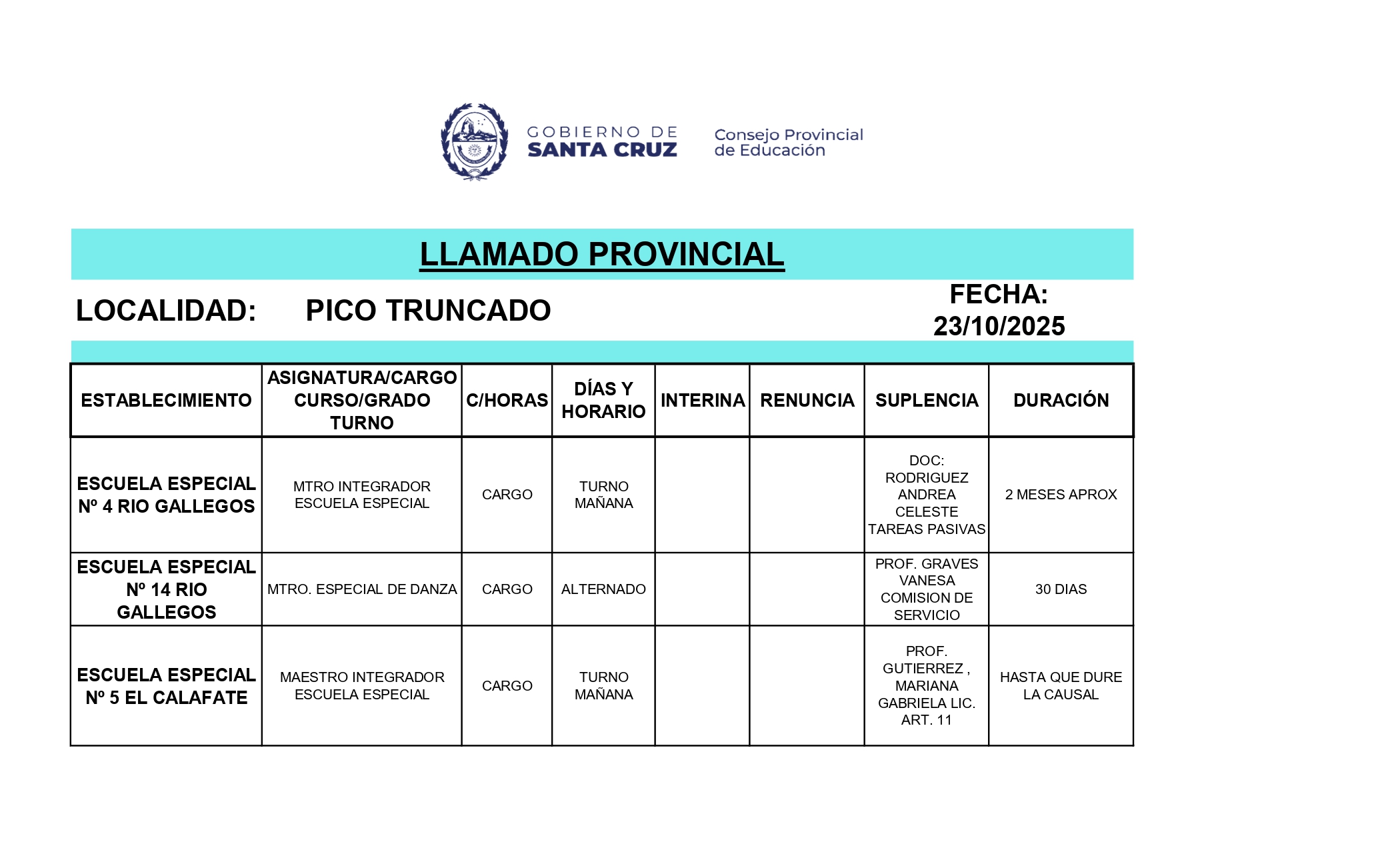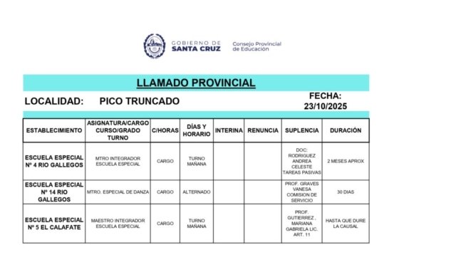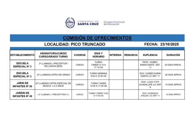 23/10/2025 | El Consejo Provincial de Educación, a través de las Comisiones de Ofrecimientos, informa que se encuentran disponibles los listados para acceder a los cargos y horas cátedra en establecimientos de diferentes localidades. Los mismos se realizarán de manera presencial.