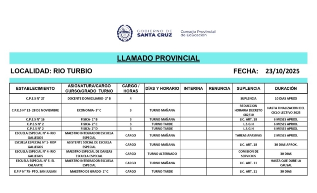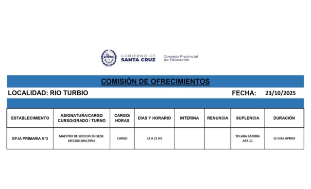 23/10/2025 | El Consejo Provincial de Educación, a través de las Comisiones de Ofrecimientos, informa que se encuentran disponibles los listados para acceder a los cargos y horas cátedra en establecimientos de diferentes localidades. Los mismos se realizarán de manera presencial.
