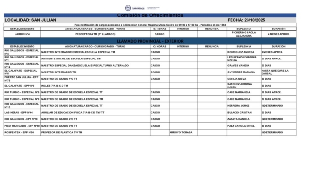 23/10/2025 | El Consejo Provincial de Educación, a través de las Comisiones de Ofrecimientos, informa que se encuentran disponibles los listados para acceder a los cargos y horas cátedra en establecimientos de diferentes localidades. Los mismos se realizarán de manera presencial.
