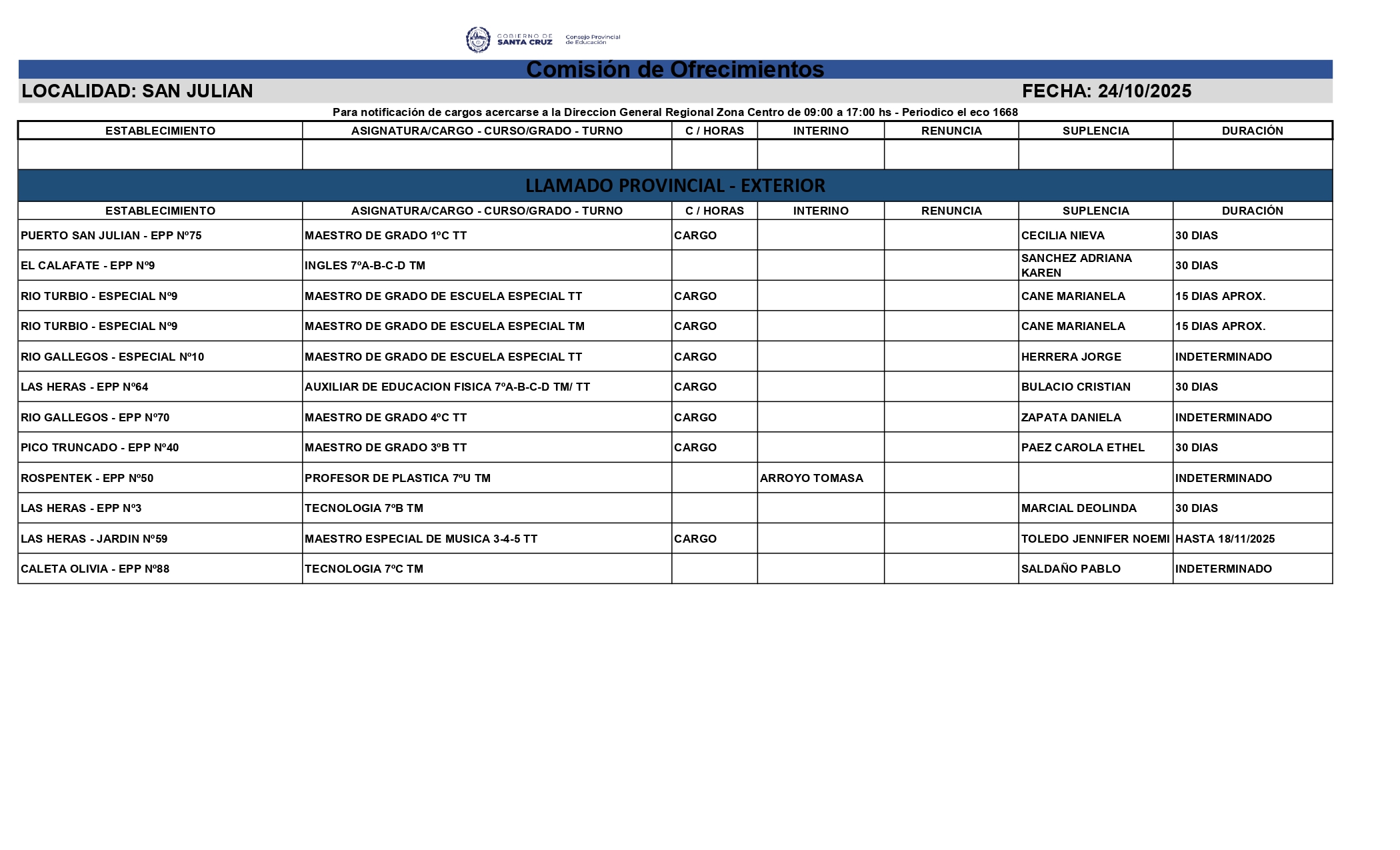 23/10/2025 | El Consejo Provincial de Educación, a través de las Comisiones de Ofrecimientos, informa que se encuentran disponibles los listados para acceder a los cargos y horas cátedra en establecimientos de diferentes localidades. Los mismos se realizarán de manera presencial.