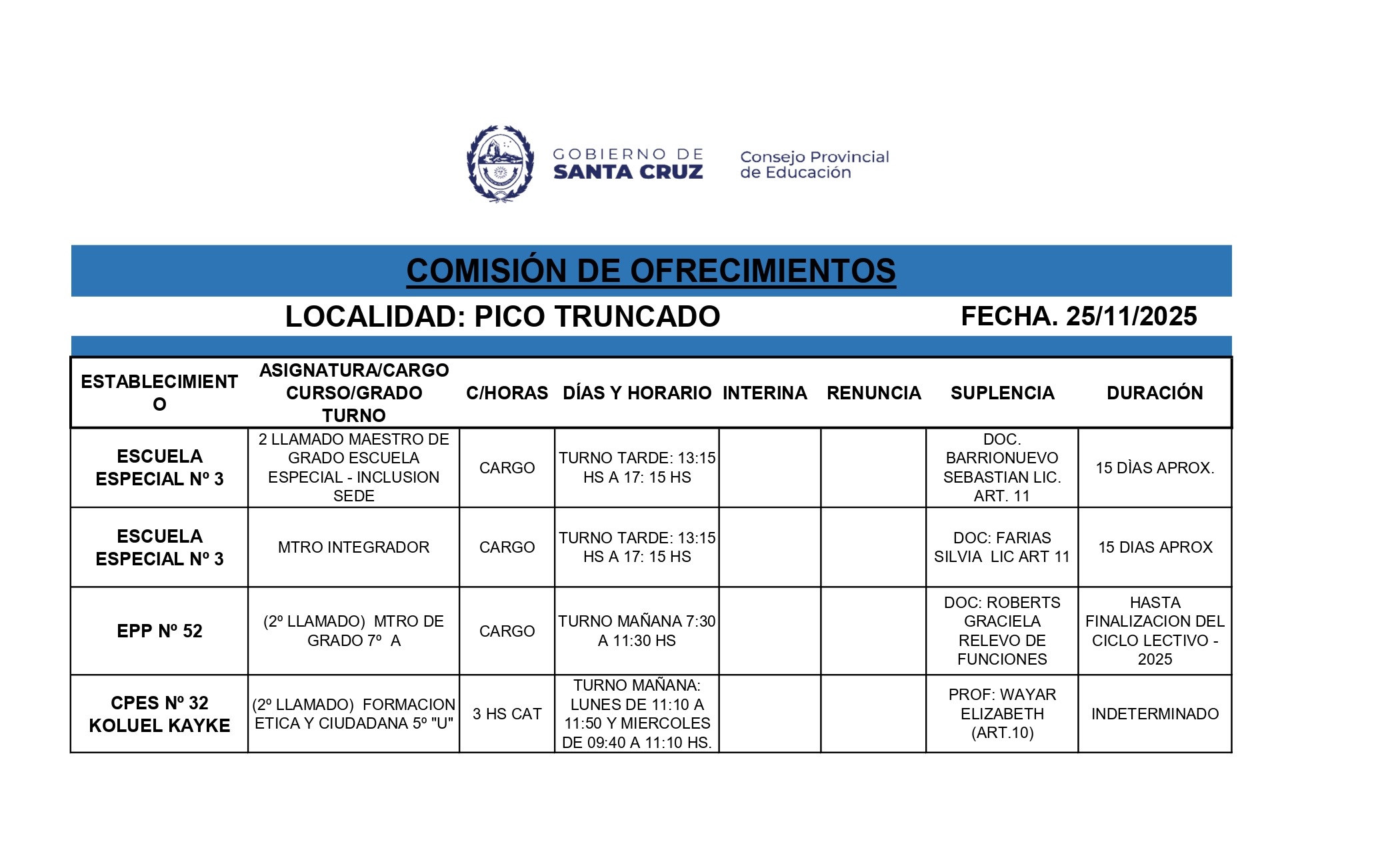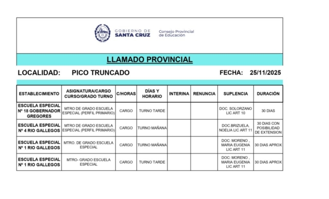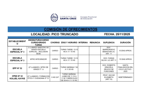 20/11/2025 | El Consejo Provincial de Educación, a través de las Comisiones de Ofrecimientos, informa que se encuentran disponibles los listados para acceder a los cargos y horas cátedra en establecimientos de diferentes localidades. Los mismos se realizarán de manera presencial.