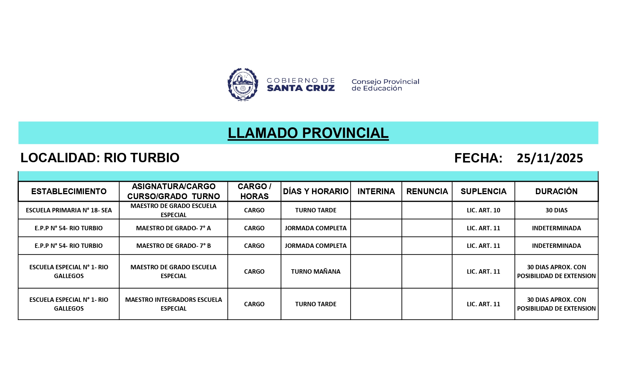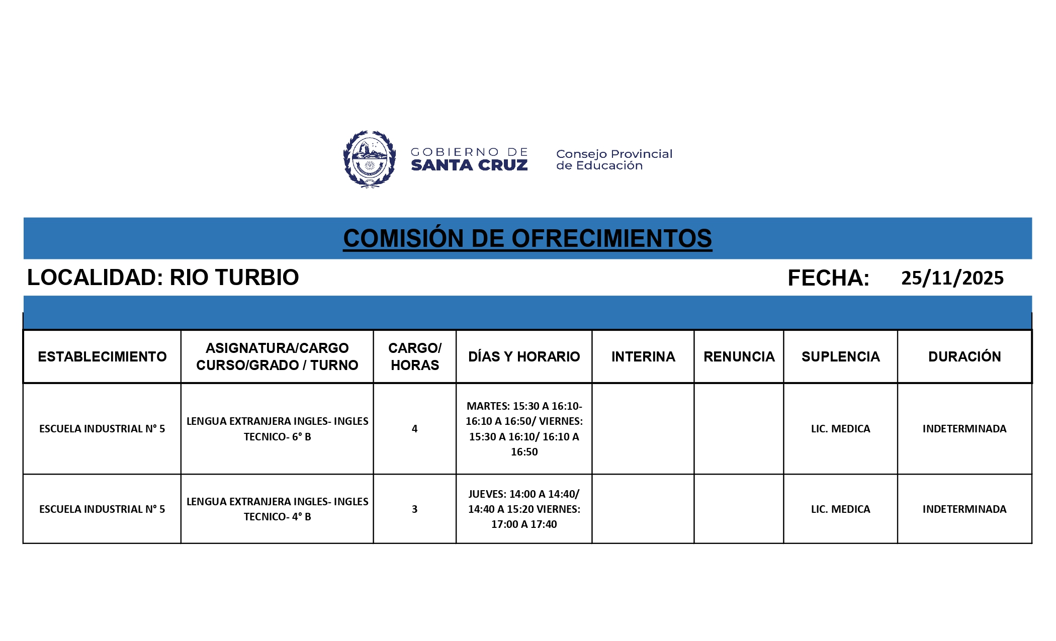 20/11/2025 | El Consejo Provincial de Educación, a través de las Comisiones de Ofrecimientos, informa que se encuentran disponibles los listados para acceder a los cargos y horas cátedra en establecimientos de diferentes localidades. Los mismos se realizarán de manera presencial.