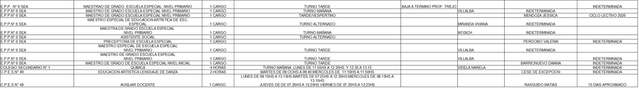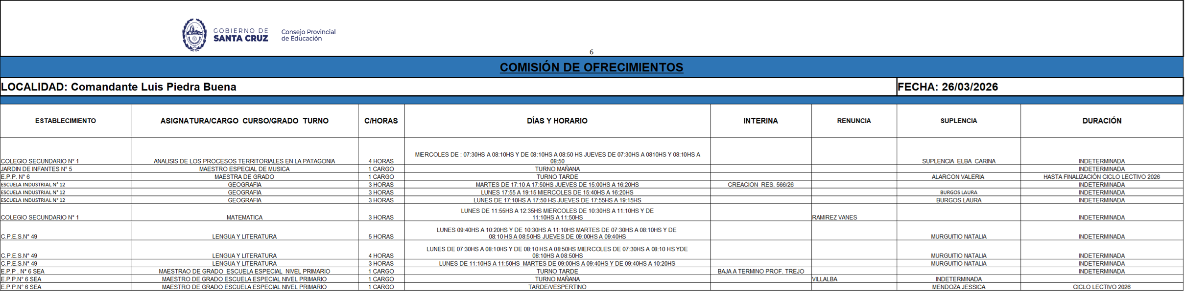 26/03/2026 | El Consejo Provincial de Educación, a través de las Comisiones de Ofrecimientos, informa que se encuentran disponibles los listados para acceder a los cargos y horas cátedra en establecimientos de diferentes localidades. Los mismos se realizarán de manera presencial.