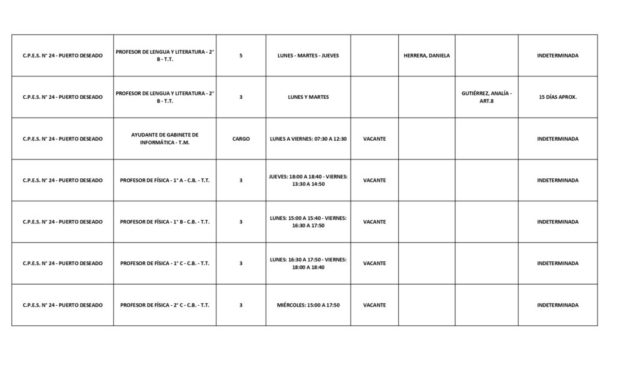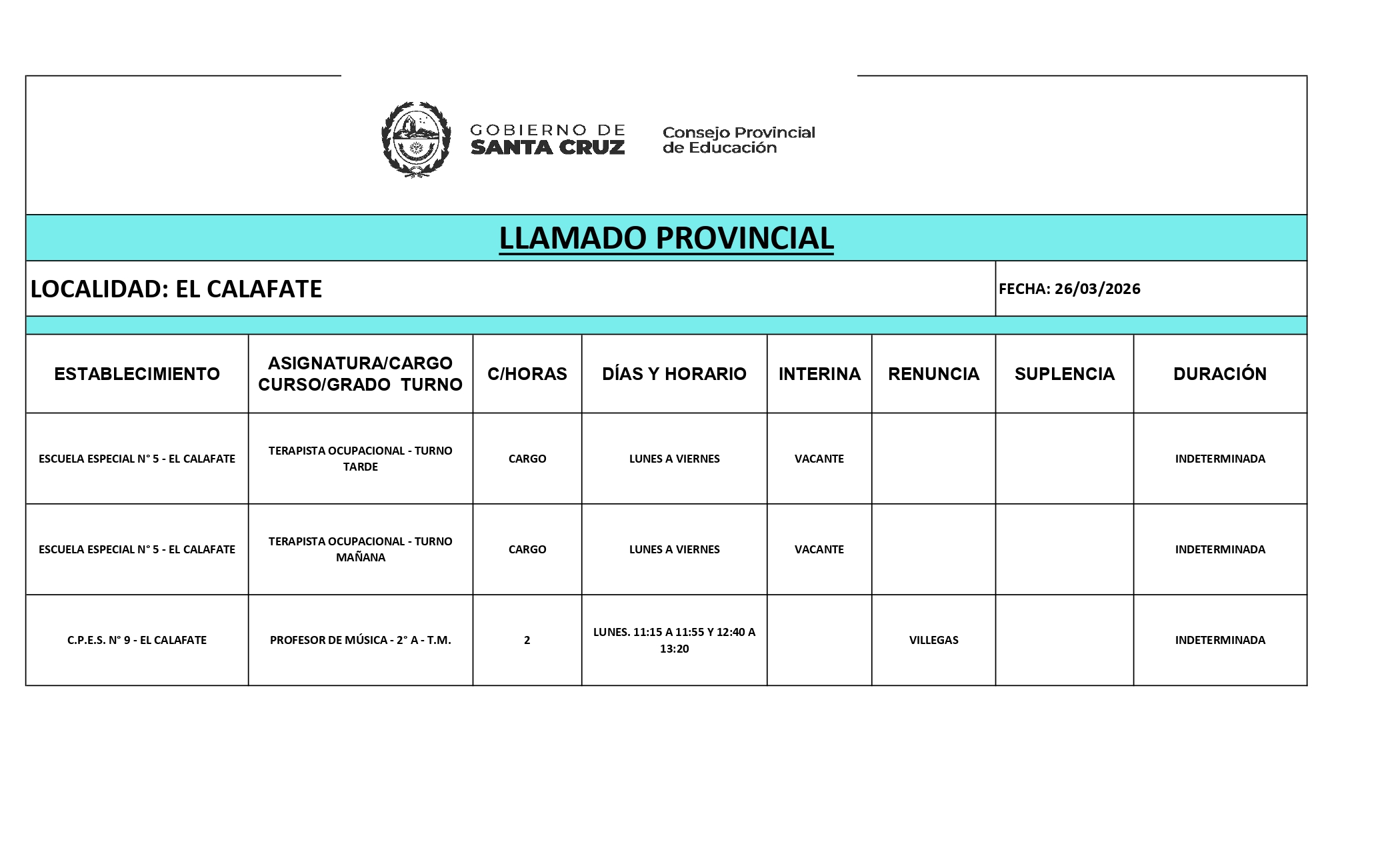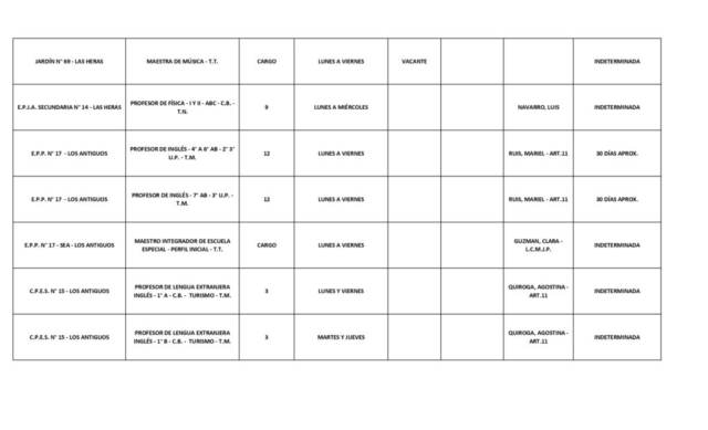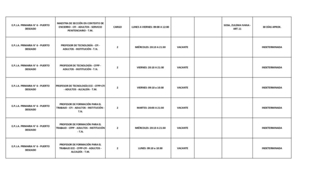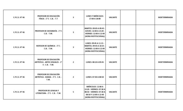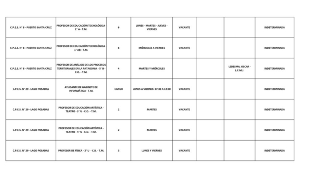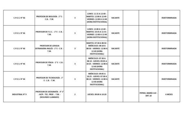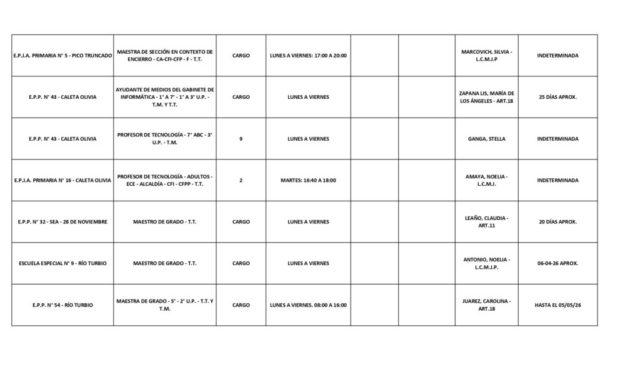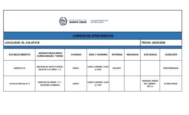 26/03/2026 | El Consejo Provincial de Educación, a través de las Comisiones de Ofrecimientos, informa que se encuentran disponibles los listados para acceder a los cargos y horas cátedra en establecimientos de diferentes localidades. Los mismos se realizarán de manera presencial.