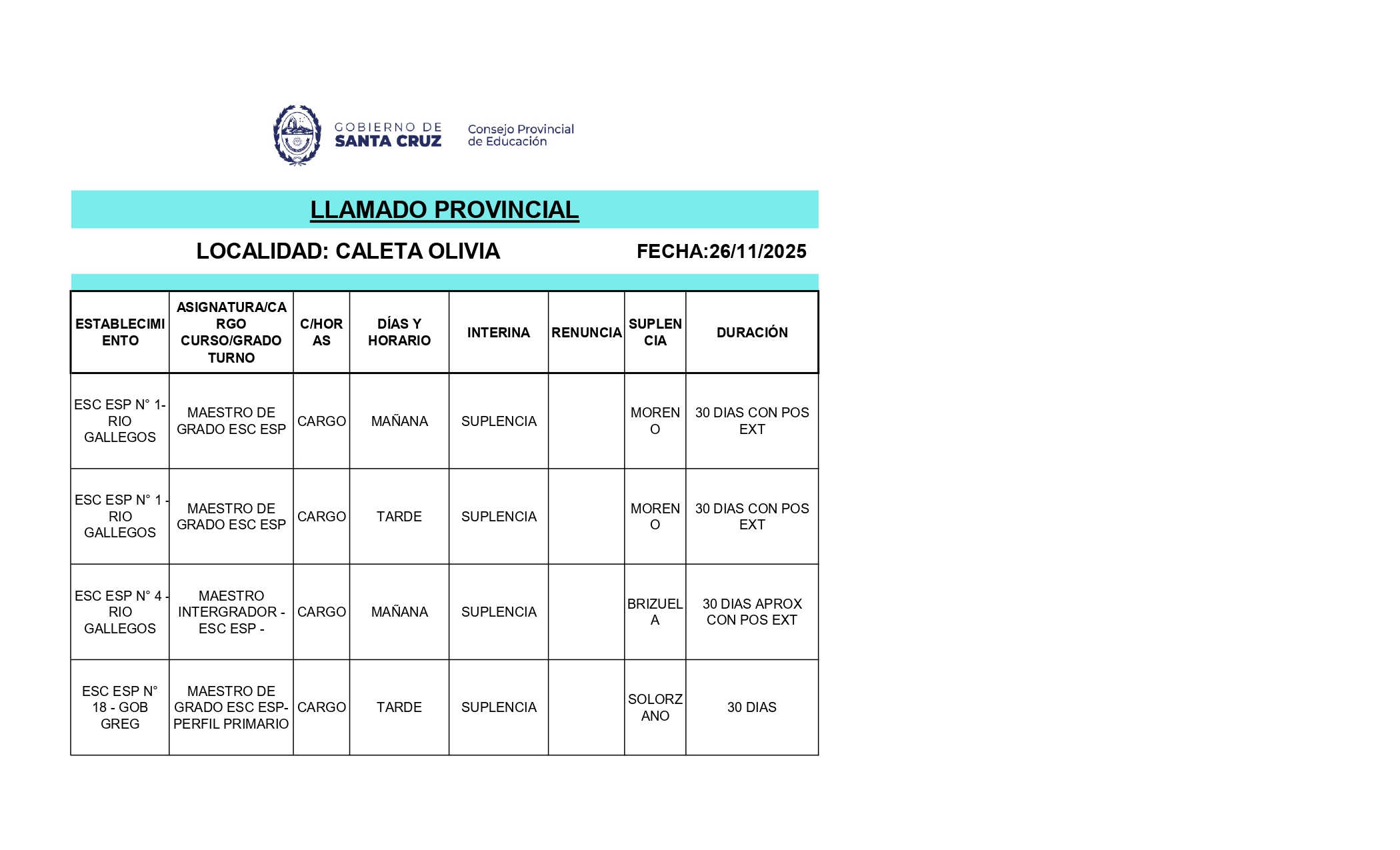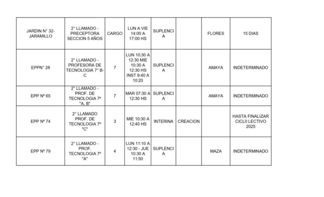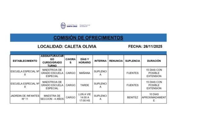 26/11/2025 | El Consejo Provincial de Educación, a través de las Comisiones de Ofrecimientos, informa que se encuentran disponibles los listados para acceder a los cargos y horas cátedra en establecimientos de diferentes localidades. Los mismos se realizarán de manera presencial.