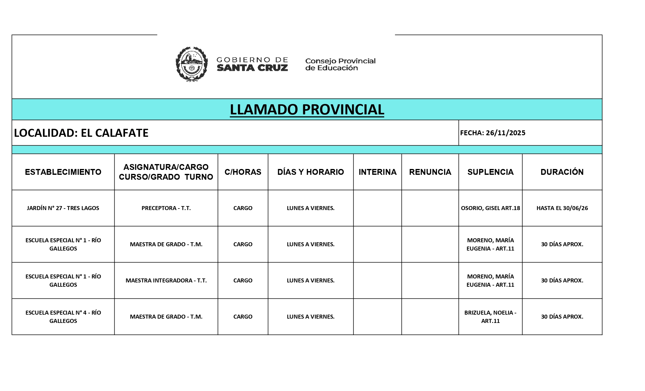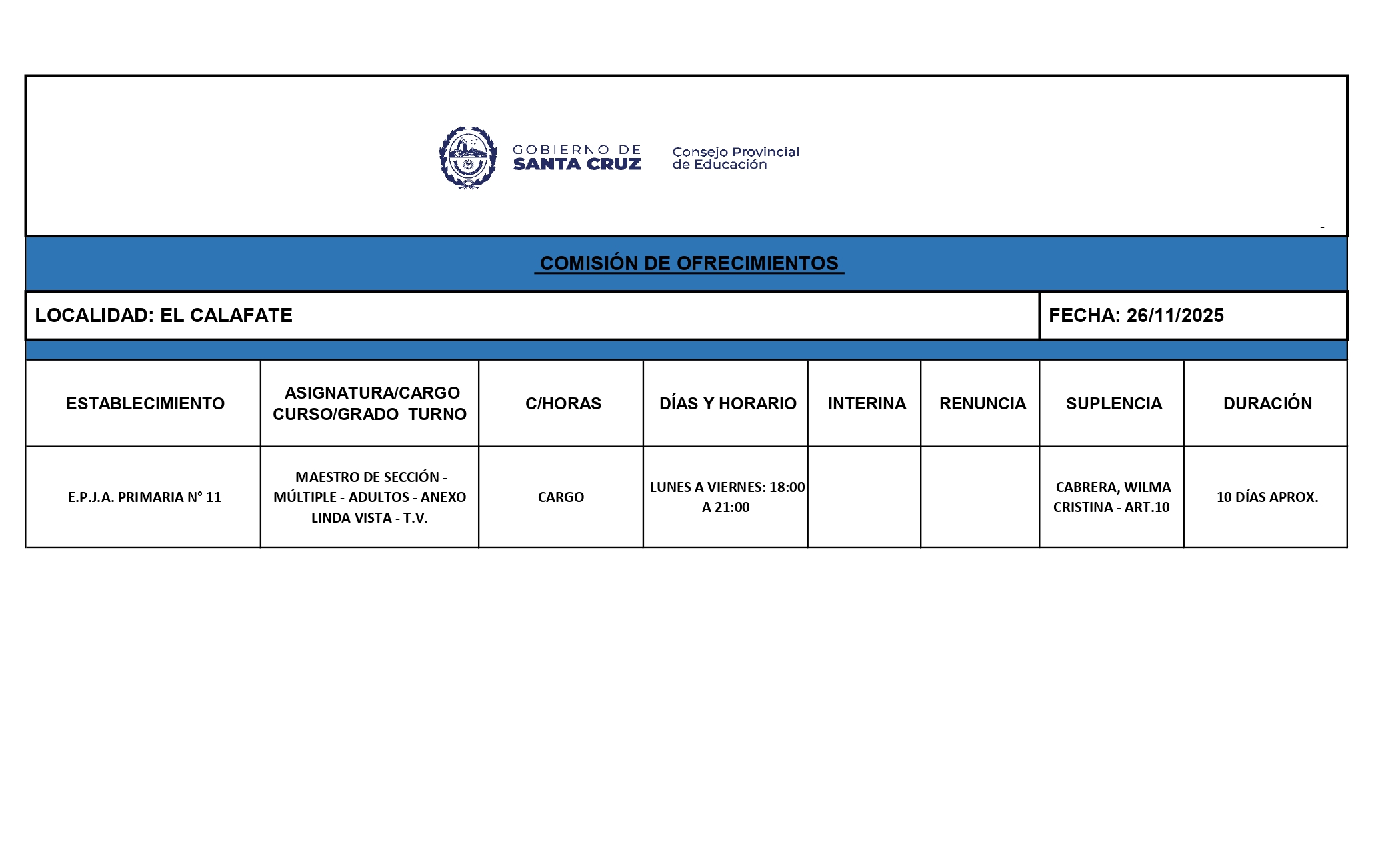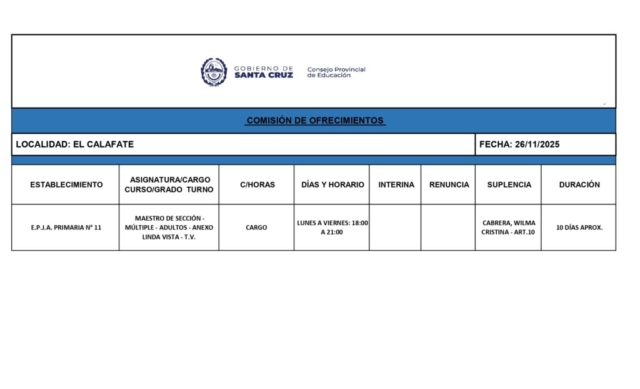 25/11/2025 | El Consejo Provincial de Educación, a través de las Comisiones de Ofrecimientos, informa que se encuentran disponibles los listados para acceder a los cargos y horas cátedra en establecimientos de diferentes localidades. Los mismos se realizarán de manera presencial.