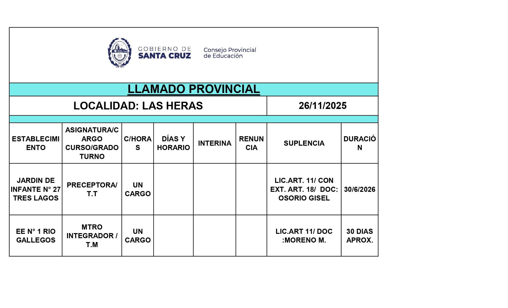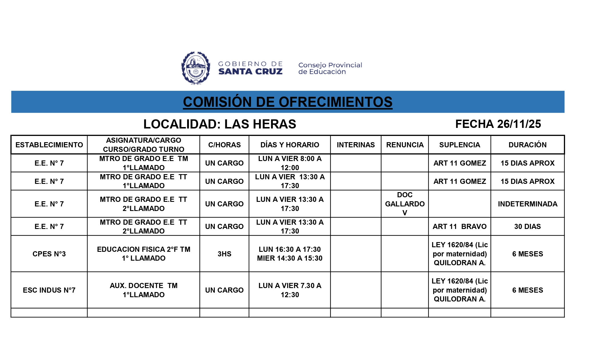 26/11/2025 | El Consejo Provincial de Educación, a través de las Comisiones de Ofrecimientos, informa que se encuentran disponibles los listados para acceder a los cargos y horas cátedra en establecimientos de diferentes localidades. Los mismos se realizarán de manera presencial.