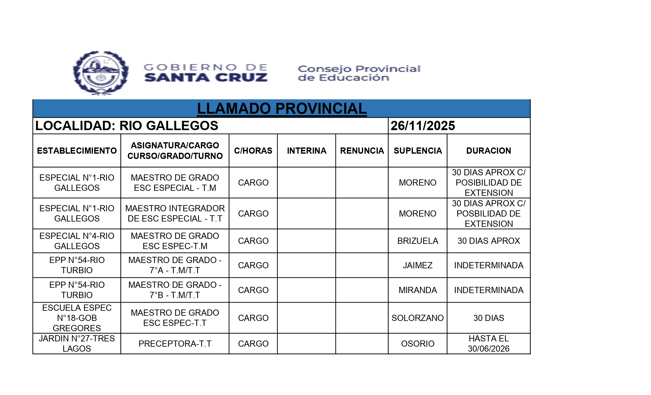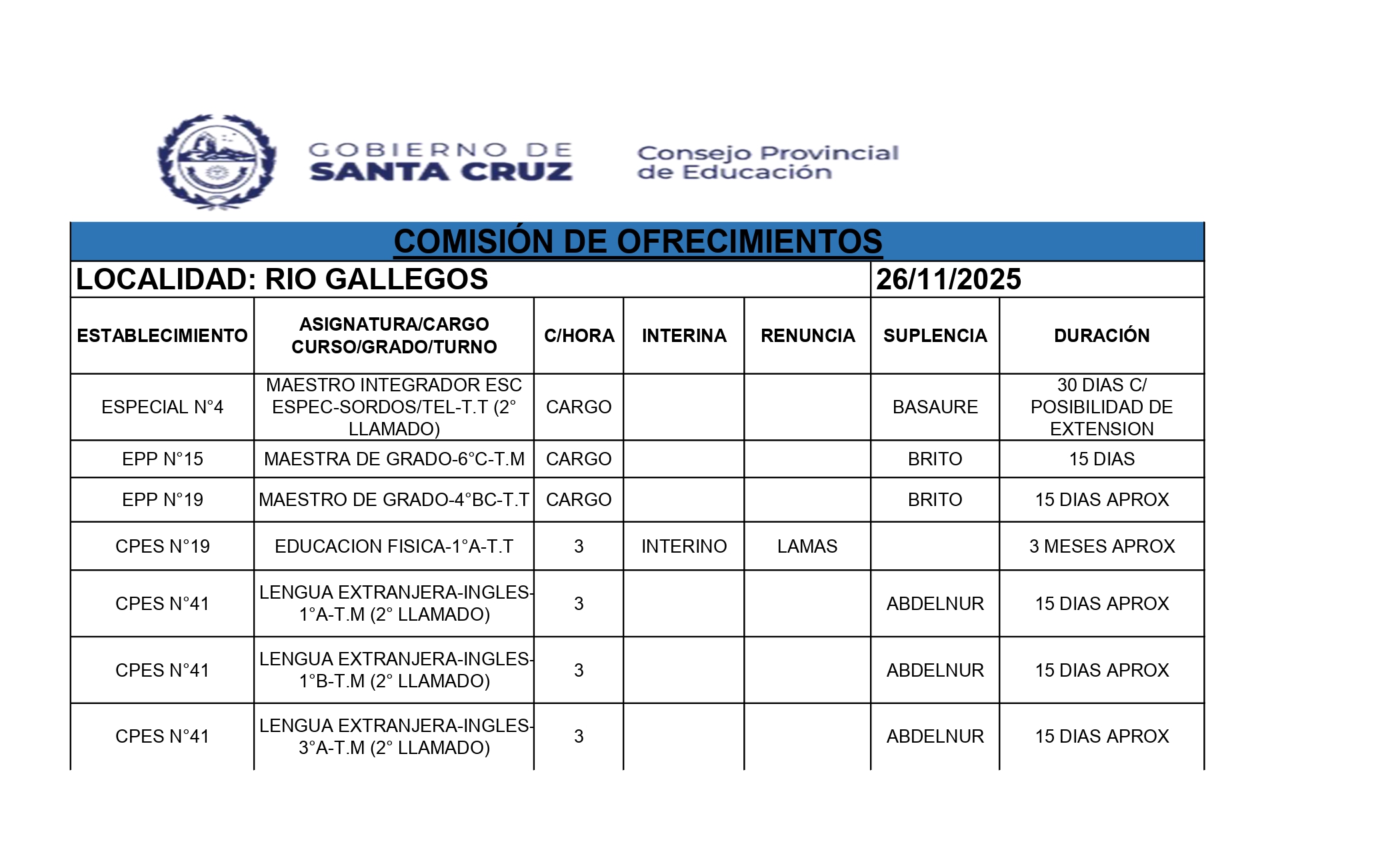 26/11/2025 | El Consejo Provincial de Educación, a través de las Comisiones de Ofrecimientos, informa que se encuentran disponibles los listados para acceder a los cargos y horas cátedra en establecimientos de diferentes localidades. Los mismos se realizarán de manera presencial.
