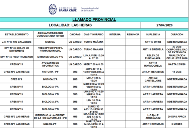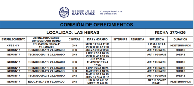 27/04/2026 | El Consejo Provincial de Educación, a través de las Comisiones de Ofrecimientos, informa que se encuentran disponibles los listados para acceder a los cargos y horas cátedra en establecimientos de diferentes localidades. Los mismos se realizarán de manera presencial.