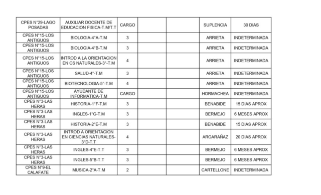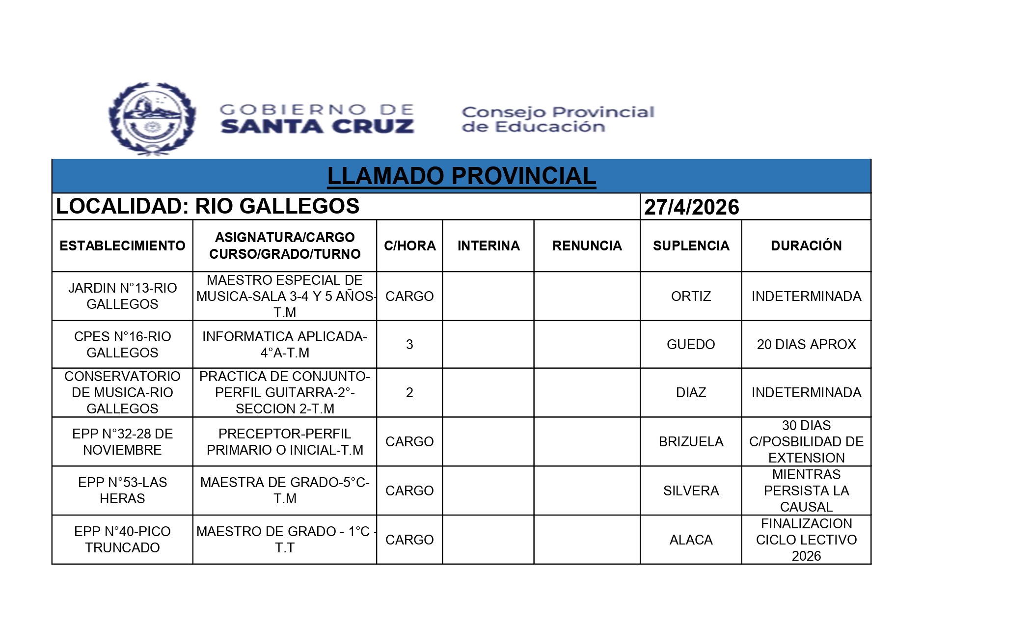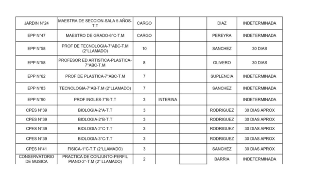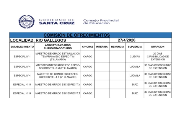 27/04/2026 | El Consejo Provincial de Educación, a través de las Comisiones de Ofrecimientos, informa que se encuentran disponibles los listados para acceder a los cargos y horas cátedra en establecimientos de diferentes localidades. Los mismos se realizarán de manera presencial.