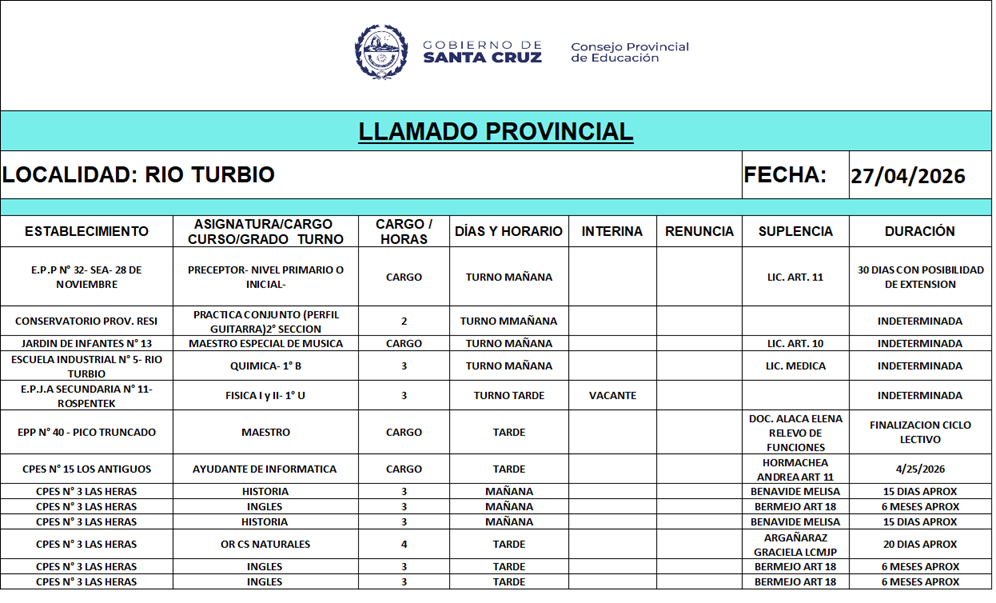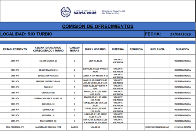 27/04/2026 | El Consejo Provincial de Educación, a través de las Comisiones de Ofrecimientos, informa que se encuentran disponibles los listados para acceder a los cargos y horas cátedra en establecimientos de diferentes localidades. Los mismos se realizarán de manera presencial.