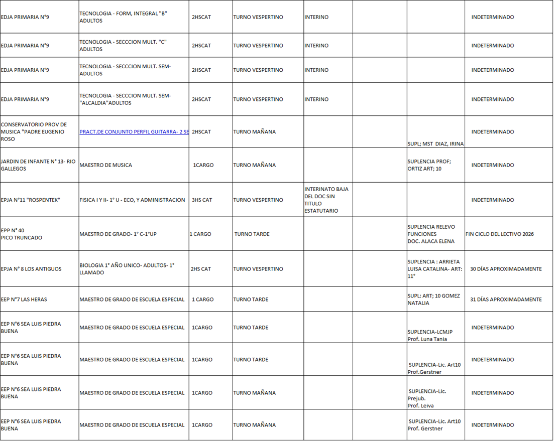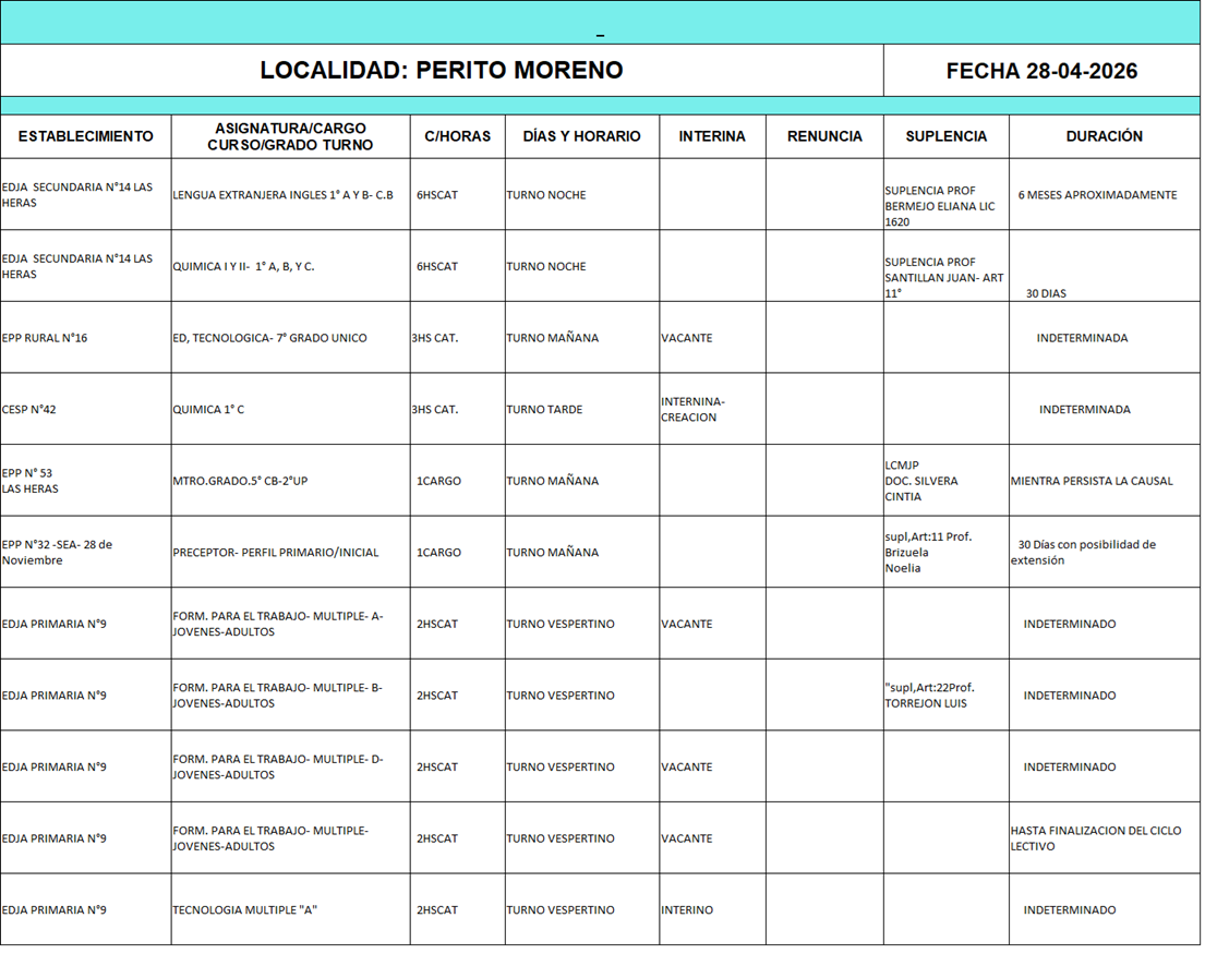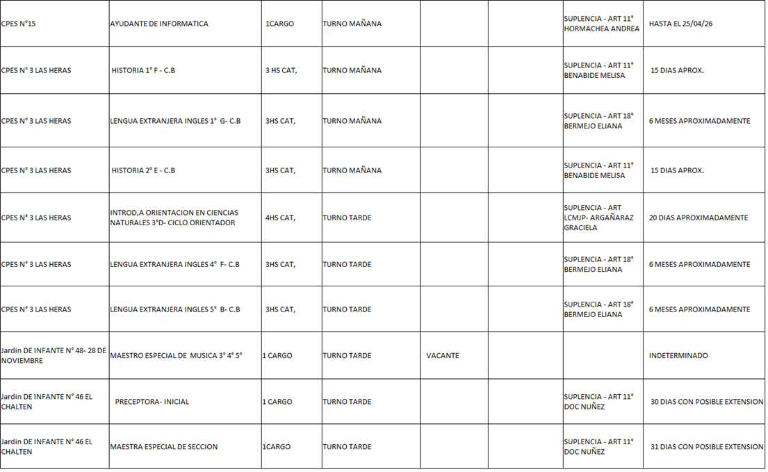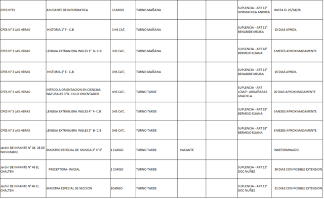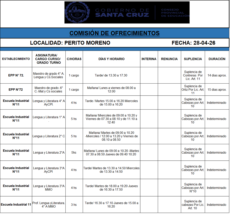 28/04/2026 | El Consejo Provincial de Educación, a través de las Comisiones de Ofrecimientos, informa que se encuentran disponibles los listados para acceder a los cargos y horas cátedra en establecimientos de diferentes localidades. Los mismos se realizarán de manera presencial.