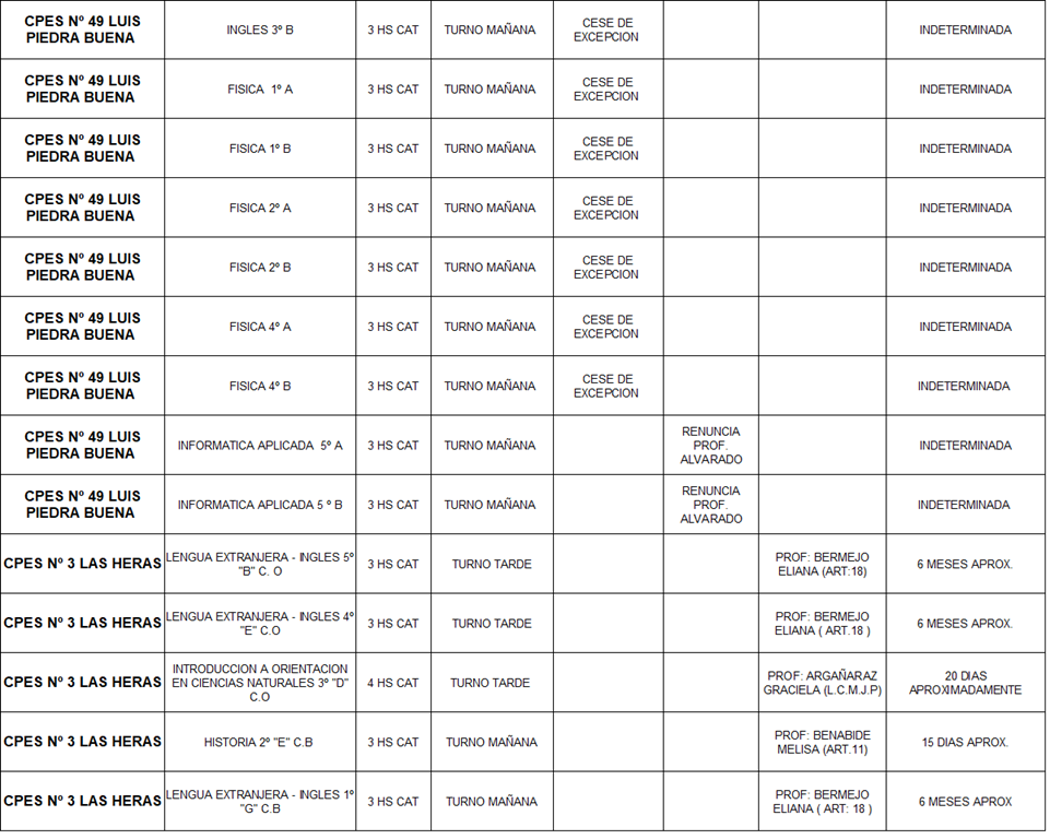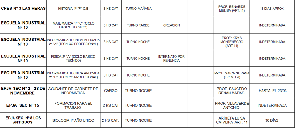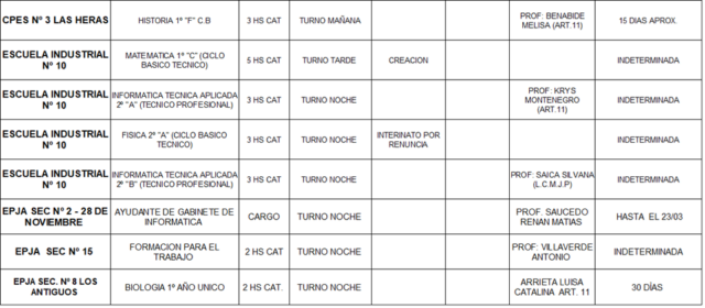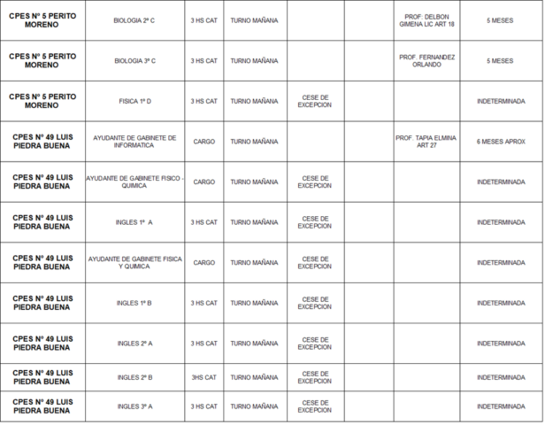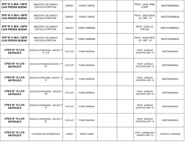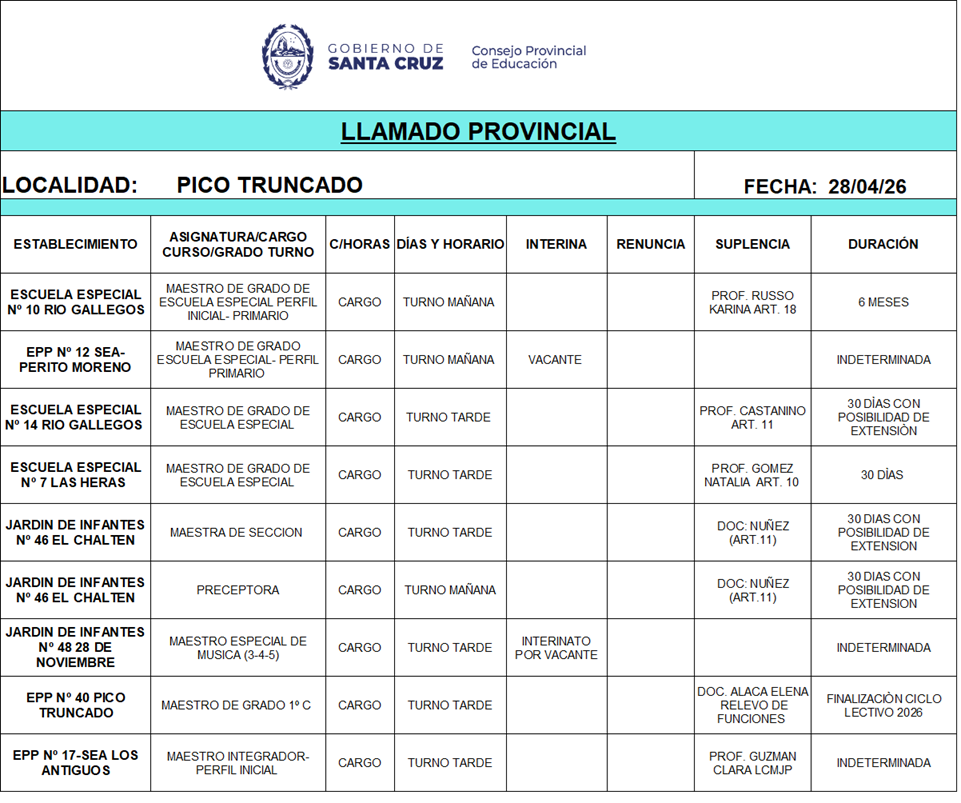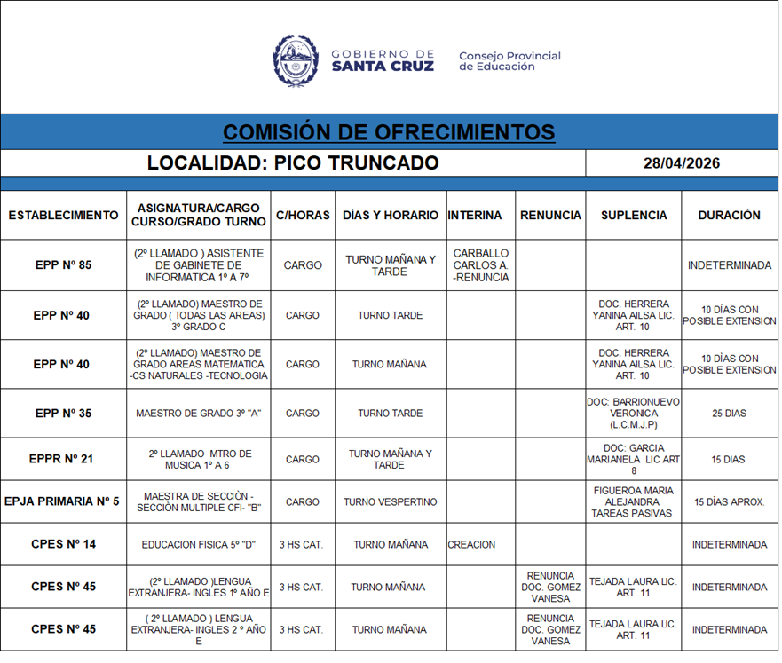 28/04/2026 | El Consejo Provincial de Educación, a través de las Comisiones de Ofrecimientos, informa que se encuentran disponibles los listados para acceder a los cargos y horas cátedra en establecimientos de diferentes localidades. Los mismos se realizarán de manera presencial.