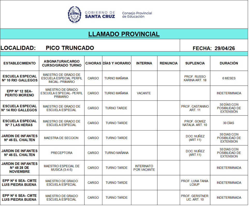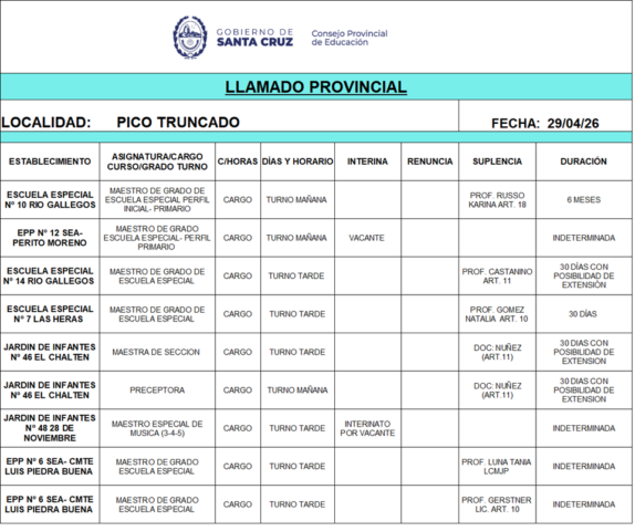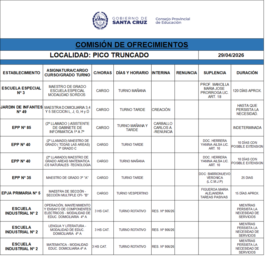 29/04/2026 | El Consejo Provincial de Educación, a través de las Comisiones de Ofrecimientos, informa que se encuentran disponibles los listados para acceder a los cargos y horas cátedra en establecimientos de diferentes localidades. Los mismos se realizarán de manera presencial.