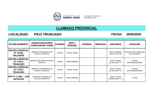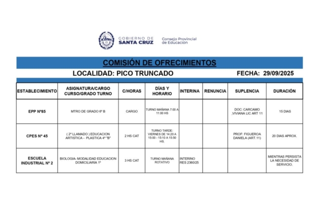 26/09/2025 | El Consejo Provincial de Educación, a través de las Comisiones de Ofrecimientos, informa que se encuentran disponibles los listados para acceder a los cargos y horas cátedra en establecimientos de diferentes localidades. Los mismos se realizarán de manera presencial.