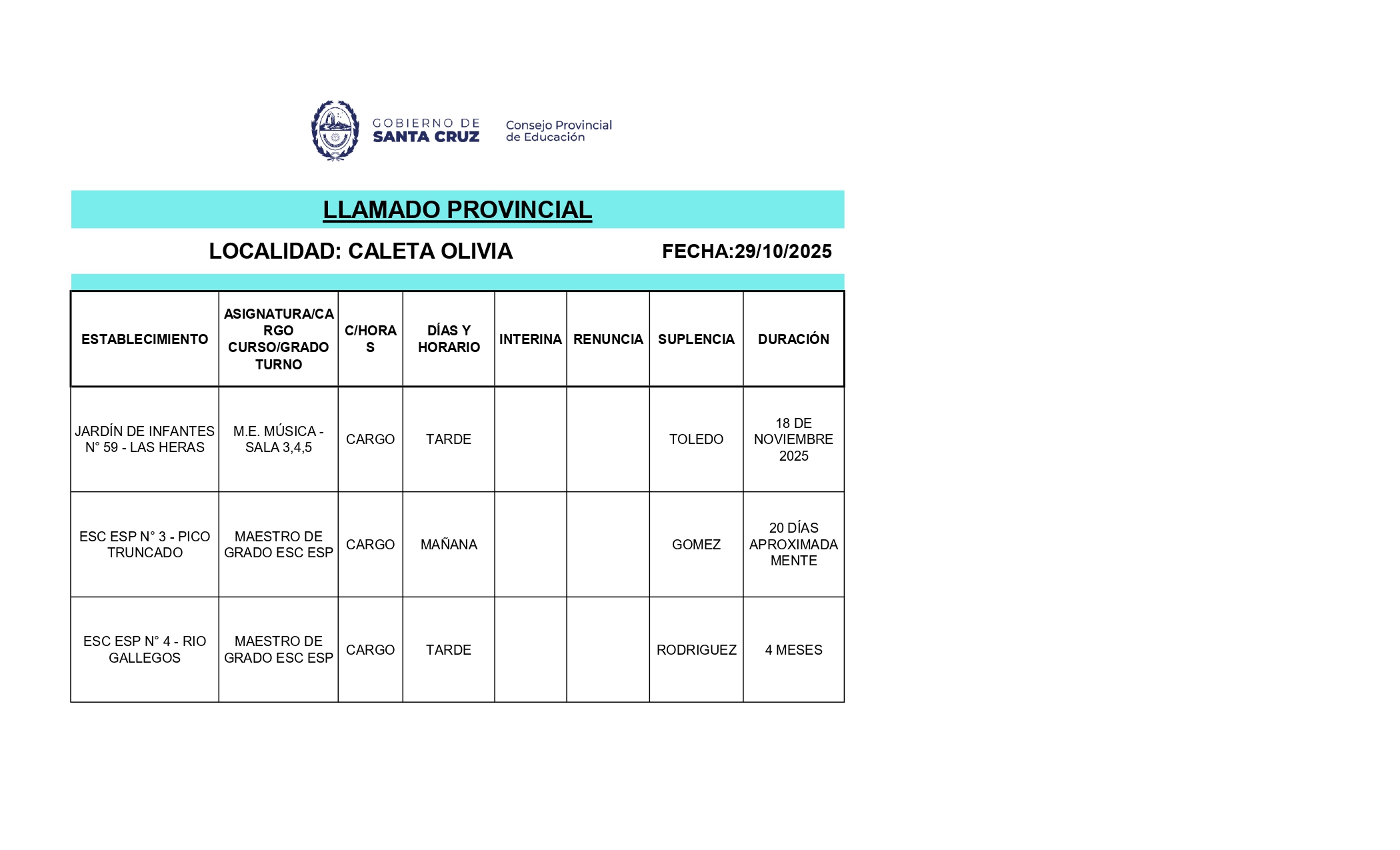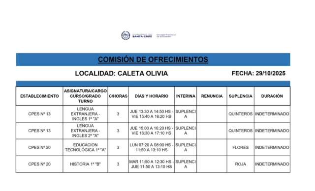 29/10/2025 | El Consejo Provincial de Educación, a través de las Comisiones de Ofrecimientos, informa que se encuentran disponibles los listados para acceder a los cargos y horas cátedra en establecimientos de diferentes localidades. Los mismos se realizarán de manera presencial.